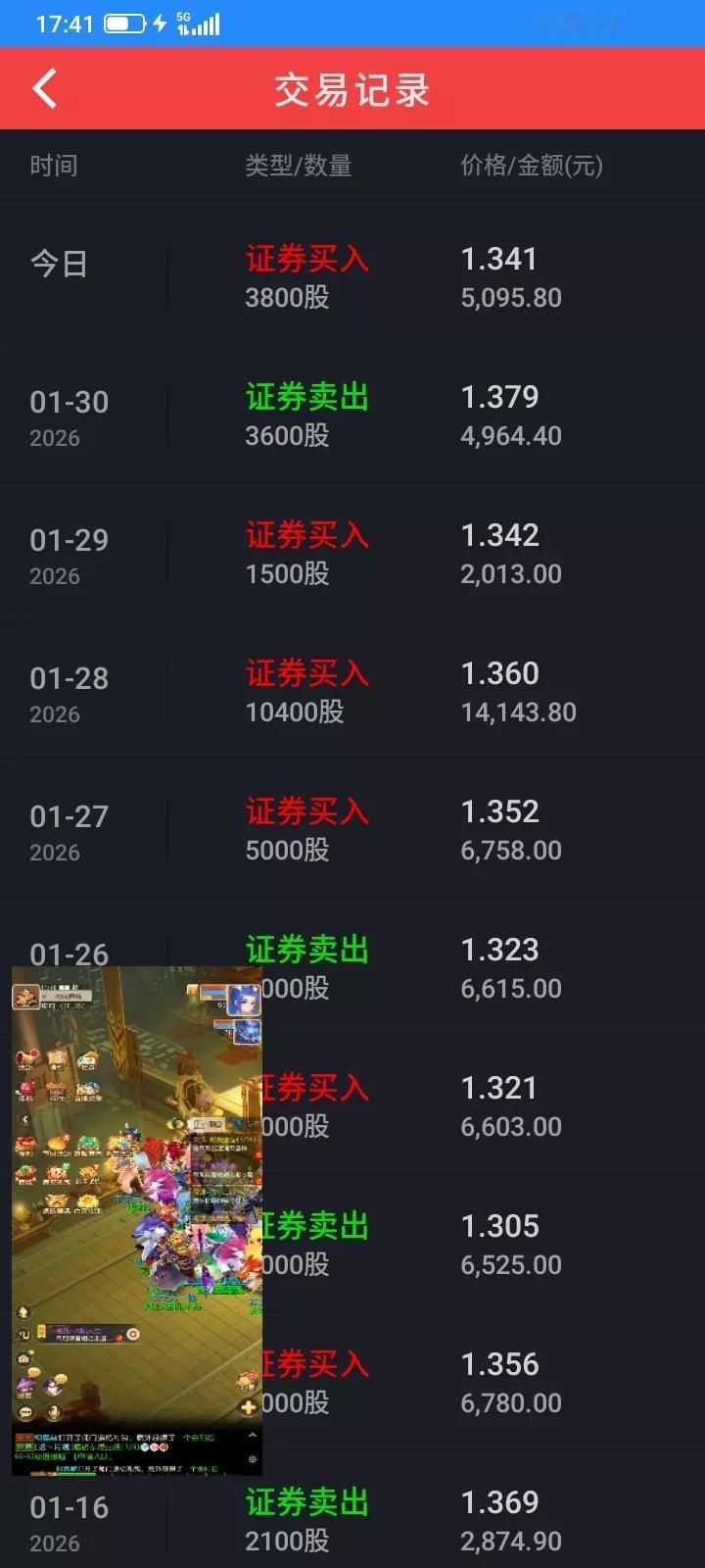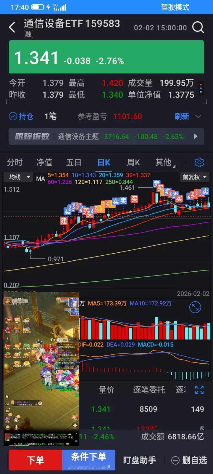 星期五通信设备etf,从星期四收盘价1.342的基础上,下跌最低跌到1.314,最高冲到1.390,收盘收在1.379,上涨卖掉3600股,今天最高冲到1.420,收盘又跌到1.341,买回来3800股,这1.379卖掉3600股,今天1.341买回来3800股,来回差价就是130多块钱,忽略最高价和最低价,赚取一百多块钱的差价,这就是网格交易的好处,上涨了卖出,下跌了买回来,按比例交易,避免一下子卖完或者没有钱补仓。虽然赚的不多,但是涨跌不惊,上涨卖,下跌买,来回赚波动的差价就可以了,股价本身涨跌就无所谓了。随着时间的推移,就会赚得比较多一点。etf更安全,更简单,什么都不用看,就看看每天收盘价就可以了,轻松从容,淡定。