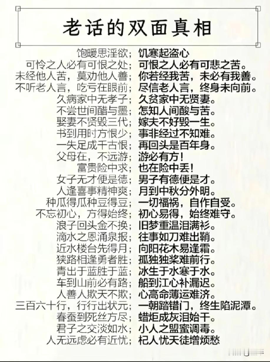 看完图片里的文字,你会有不一样的发现![呲牙] 刷到一张图,标题叫《老话的双面真相》,盯着看了足足五分钟,越看越觉得后背发麻。 我们总说“不听老人言,吃亏在眼前”,可下一句就是“尽信老人言,终身未向前”。 老祖宗的智慧从来不是单向的标准答案,而是把人生的正反面都摊开给你看。 “饱暖思淫欲”是人性的幽暗,“饥寒起盗心”是现实的无奈。 “可怜之人必有可恨之处”是清醒,“可恨之人必有可悲之苦”是慈悲。 “父母在,不远游”是孝道,“游必有方”是责任与分寸的平衡。 这些刻在骨血里的老话,哪一句不是我们正在经历的人生? 我们一边信奉“种瓜得瓜种豆得豆”的因果,一边又在“初心易得,始终难守”里反复拉扯。 一边感叹“车到山前必有路”的豁达,一边又怕“船到江心补漏迟”的遗憾。 时代变了,房价涨了,我们用的是智能手机,但人性的底层逻辑从未改变。 老祖宗用几千年的经验告诉我们:所谓“尽人事,听天命”,不是躺平,是尽力之后的释然; 不是认命,是看清生活的双面性后,依然选择认真地活。 这世上没有绝对的真理,只有辩证的人生。 与其纠结“对与错”,不如读懂“阴与阳”。 毕竟,真正的成熟,是听懂老话里的两面,然后走好眼前的每一步。 一句话记录冬日心情命运 扎心