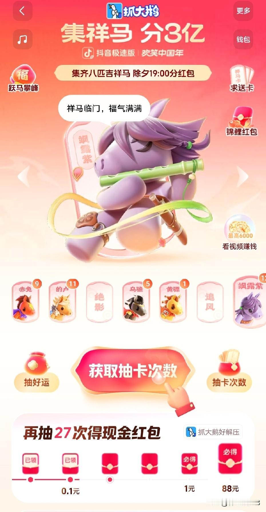 抖音一年一度的集卡又开始了,目前我缺少绝影和追风马,谁有多余的马可以和我换,要是给我没有我也给红包 赶紧行动起来吧,这种活动都是刚开始简单后面就增加难度了