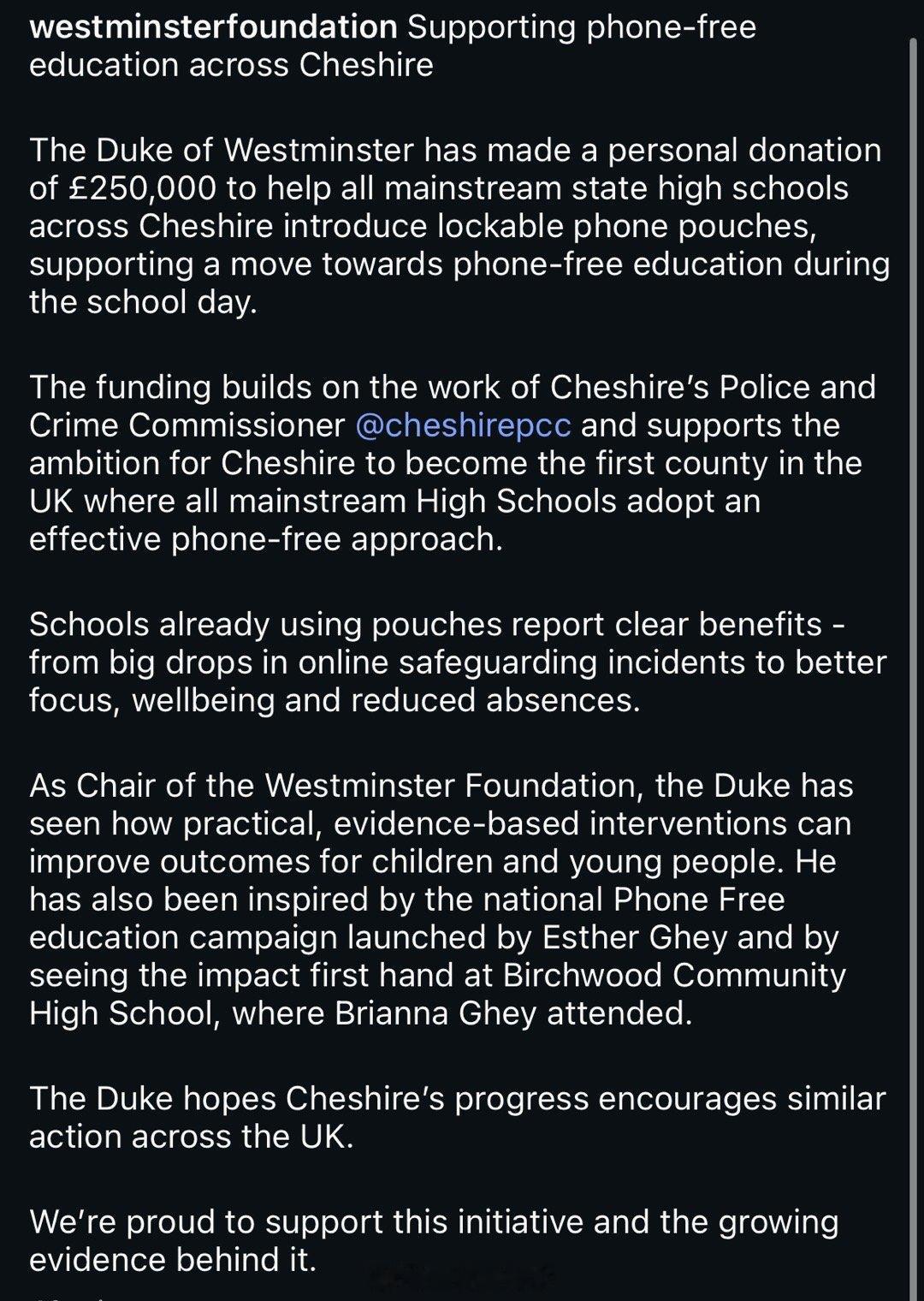 作为家里有几个月大女儿的人,威廉王储的死党威斯敏斯特第七代公爵休格罗夫纳在柴郡捐了25万英镑,以推行柴郡学校上课期间实行“没有手机”教育模式,柴郡学校都会配备可以上锁的手机袋,以改善青少年网络冲浪情况📱
