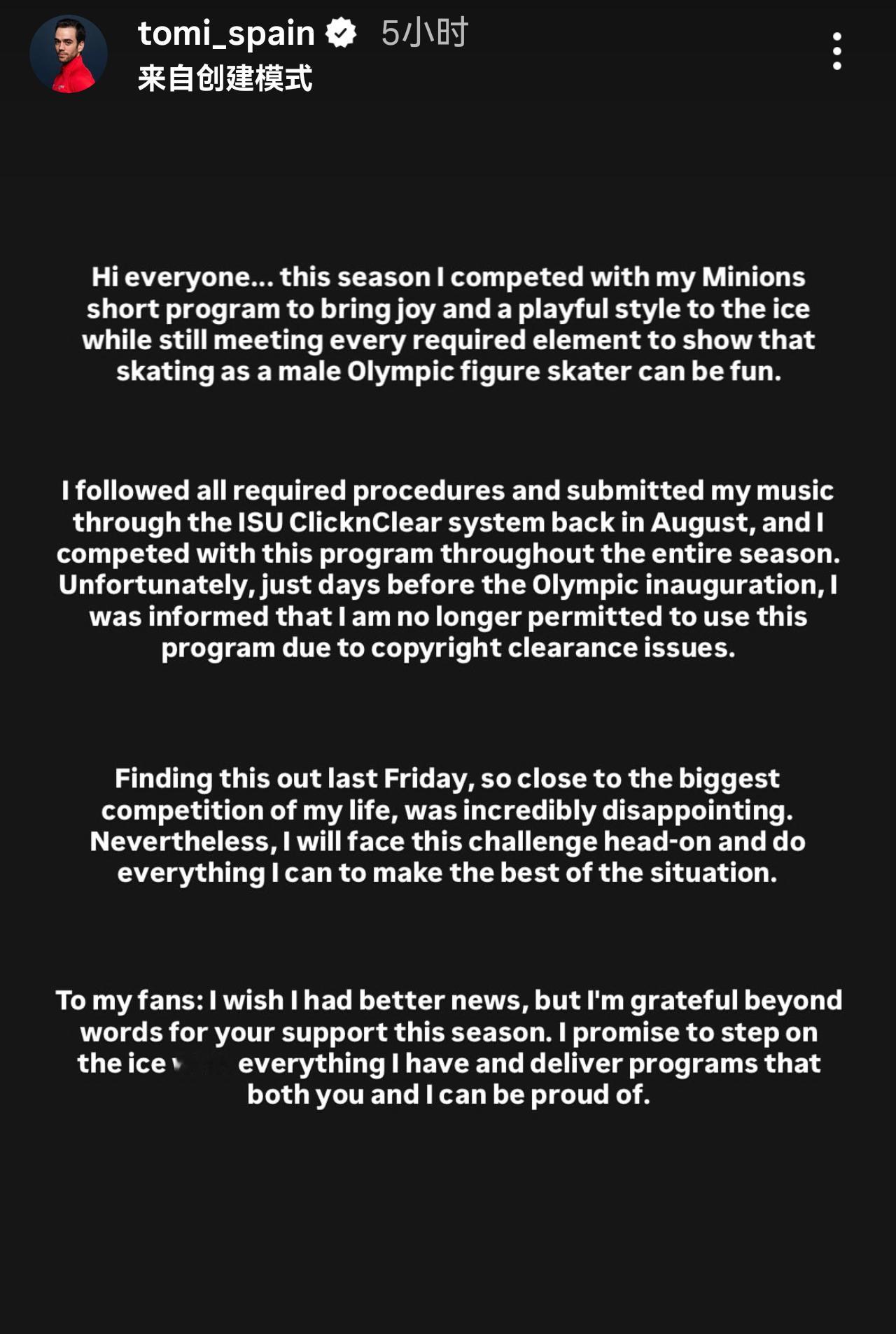 托米大家好….这个赛季我与我的小家伙们短节目比赛,为冰上带来快乐和玩乐风格,同时仍然满足每一个要求的动作元素,以展示作为一个男性奥运花样滑冰选手滑冰也可以很有趣.我遵循所有必要的程序,在八月份通过 ISU ClicknClear 系统提交了我的音乐,并在整个赛季中使用这个节目参赛。不幸的是,在奥运会开幕前几周,我被告知由于版权问题,我不再被允许使用这个节目。上周五得知这个消息,距离我生命中最重要的一场比赛仅剩几天了,这让我非常失望。然而,我会直面这一挑战,并尽我所能来充分利用这种情况.致我的粉丝们:我希望我有更好的消息,但我要用言语表达我对你们本赛季的支持心存感激。我承诺会倾尽全力走上冰面,并呈现既让你们也让我感到骄傲的作品。