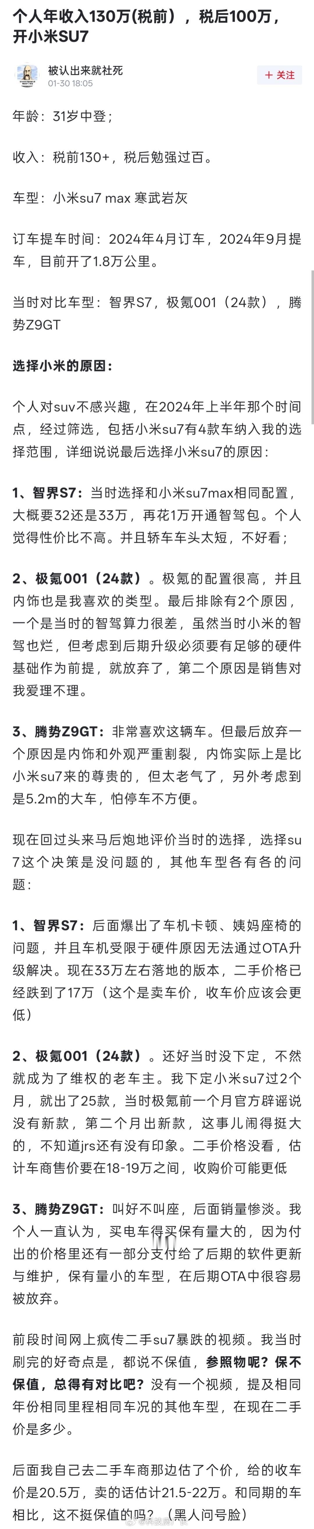 年入百万的大佬发帖说选择小米SU7的原因,不少网友说一股营销味,你们觉得呢?