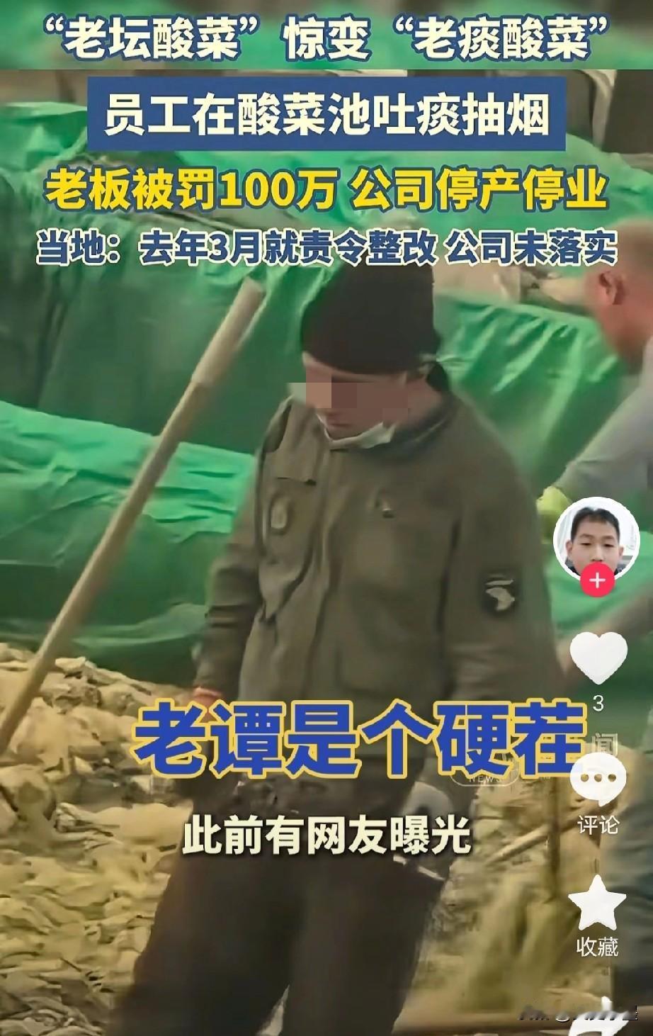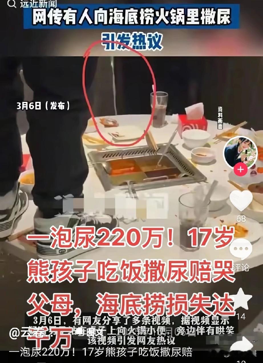 一口痰100万,一泡尿220万! 这两件事都是因为当事人的素质问题而引发的! 工人做酸菜时不但抽烟还将痰吐到池子里,他明知道这些酸菜是给人吃的还这样做,是因为他的职业素质太低了,其次他自己不会吃这些酸菜,至于谁会吃他根本不关心! 两名少年吃火锅,其中一人向火锅里撒尿,他并不只是觉得好玩吧,估计他们平时也没少干这种事吧,他在撒尿时根本不会关心下次谁会再用这个锅涮羊肉吧! 还有把纸尿裤扔到火锅里的家长,这些人的问题都是素质太低了。 然而,现实是残酷的,给他们上了一堂生动的素质教育课,只不过这堂课的学费有点贵罢了!