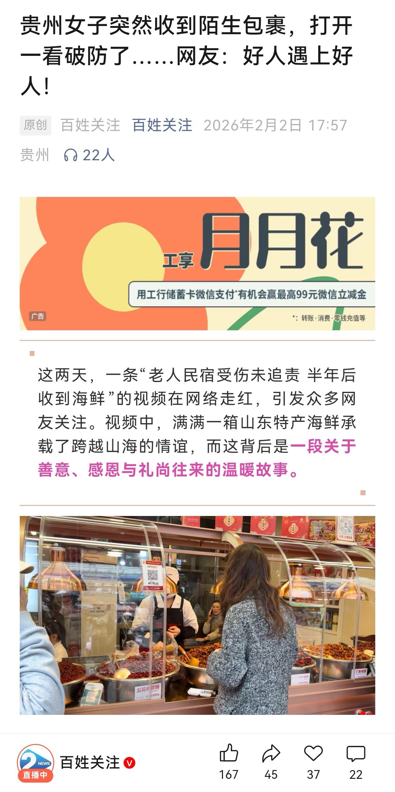 两家敞亮人!贵州的李阿姨去年在山东日照旅游时,住一家民宿,被瓷砖砸了脚,不仅肿了还出了点血。 山东民宿老板没有推诿责任,第一时间送医、还主动赔偿,还主动提出免房费,山东老板有担当,敞亮! 贵州的李阿姨呢,认为别人也是小本生意,“该付的钱一分不能少”“我们就是老实人,人家做生意不容易”,最后连老板要免的房费都照常付了。这份厚道,更是敞亮中的敞亮! 事情过去半年了,贵州的阿姨都忘了这事,觉得早翻篇了,可是2026年1月28号,快过年时,李阿姨收到一箱海鲜,原来是这位山东老板一直没忘,一箱海鲜跨过千里,带着新年的祝福,到了贵州。 这箱海鲜不是赔偿,而是心里始终有份“过意不去”,对当时贵州阿姨不计较的感恩之情的回馈。这份“迟来的感恩”,不是客套,是真心实意的惦记啊! 而贵州李阿姨一家的回礼,也接得漂亮。没有扭捏推辞,没有觉得理所应当,2月2号立刻购买贵州的特产,辣子鸡、特色小吃等,把这份情谊又热乎乎地传了回去。 这一来一回,情分活了,在山东和贵州之间流淌起来…… 这份双向奔赴的情意,可称为冬日最暖情意了吧!没有出现出了事就扯皮、算清账就两清、没有占到点便宜不罢休的剧情,两家敞亮都主动的让一步,事后还进了一步。 你敬我一尺,我心里有数;我敬你一丈,情谊更长。这种“双向奔赴”的厚道,才是咱中国人骨子里最认可、也最暖心的交往。为双份的敞亮,点赞! 陌生人之间的这种纯粹的体谅与记挂,难道不是冬日里最暖的情谊吗? 信息来源:百姓关注