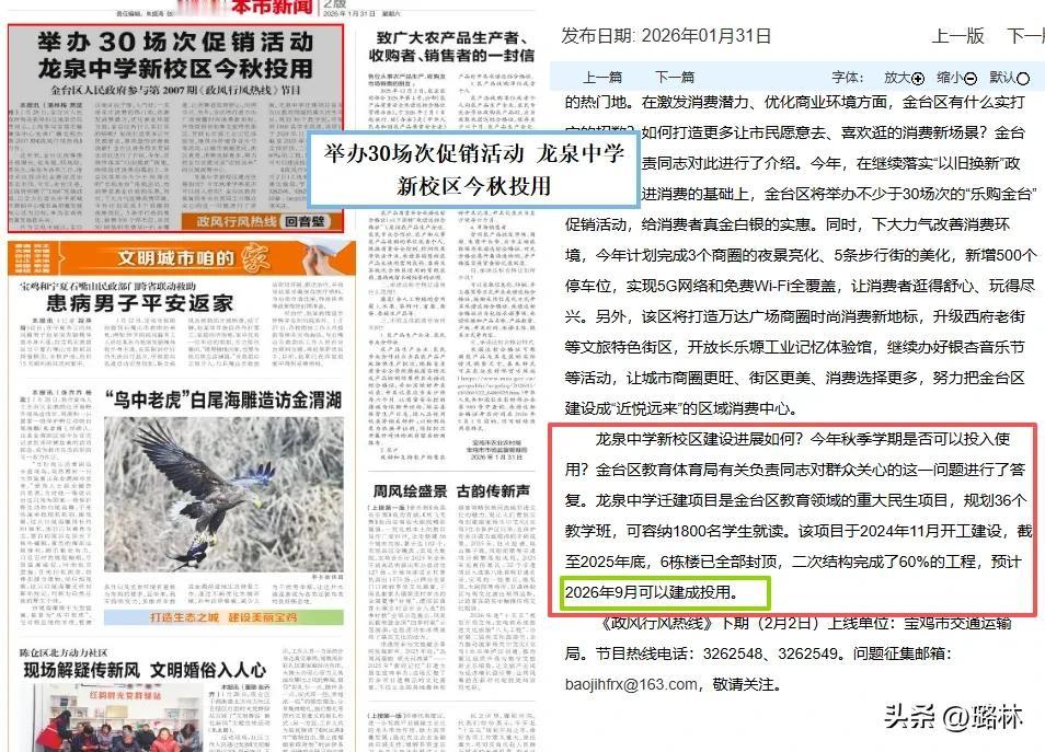 新增1800个学位!金台区龙泉中学新校区预计今年秋季投用 项目 2024 年 11 月正式开工,截至 2025 年底,校区 6 栋楼已经全部封顶,二次结构完成了 60% 学校占地面积约87.9亩,新建建筑面积约2.62万平方米,主要包括2栋5层教学楼,配套建设400米环形跑道体育运动场、大门以及门房、体育器材室等附属设施。按照规划,新校区足足设置 36 个教学班,能容纳 1800 名学生就读,以后再也不用挤破头抢学位!更让人期待的是,校区还配备了标准化运动场和图书馆,娃们上学不仅能享优质师资,还能有宽敞舒适的活动、阅读空间。