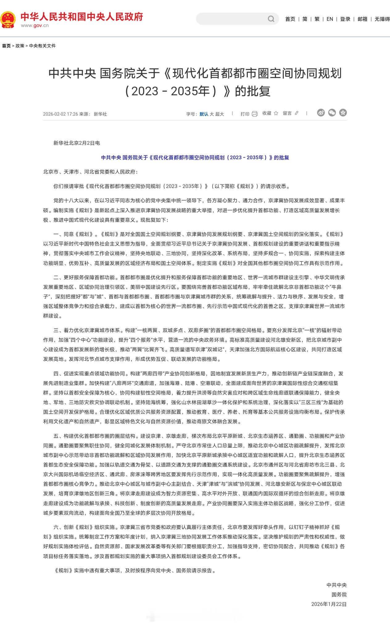 中共中央、国务院今日发布关于《现代化首都都市圈空间协同规划(2023-2035年)》的批复。