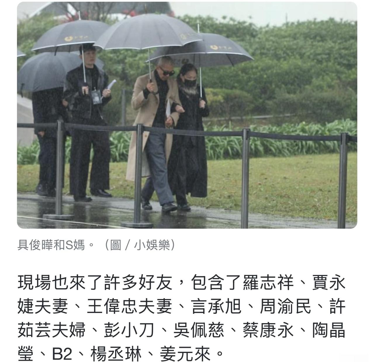 今天是大s离开的一周年,来了好多家人和朋友来送她。 前男友仔仔和剧中CP言承旭都来了。 两个人看起来都很悲伤,看得出来,他们也很想念这个可爱又爽朗的女生。 还有杨丞琳,崔始源,罗志祥,大s的高中好友小刀。 还有早已把大小s当家人的康永哥和伟忠哥, 还有大s的姐妹淘吴佩慈,范晓萱,阿雅,范玮琪。 大s看到这些亲友团来看望她,应该很欣慰吧。