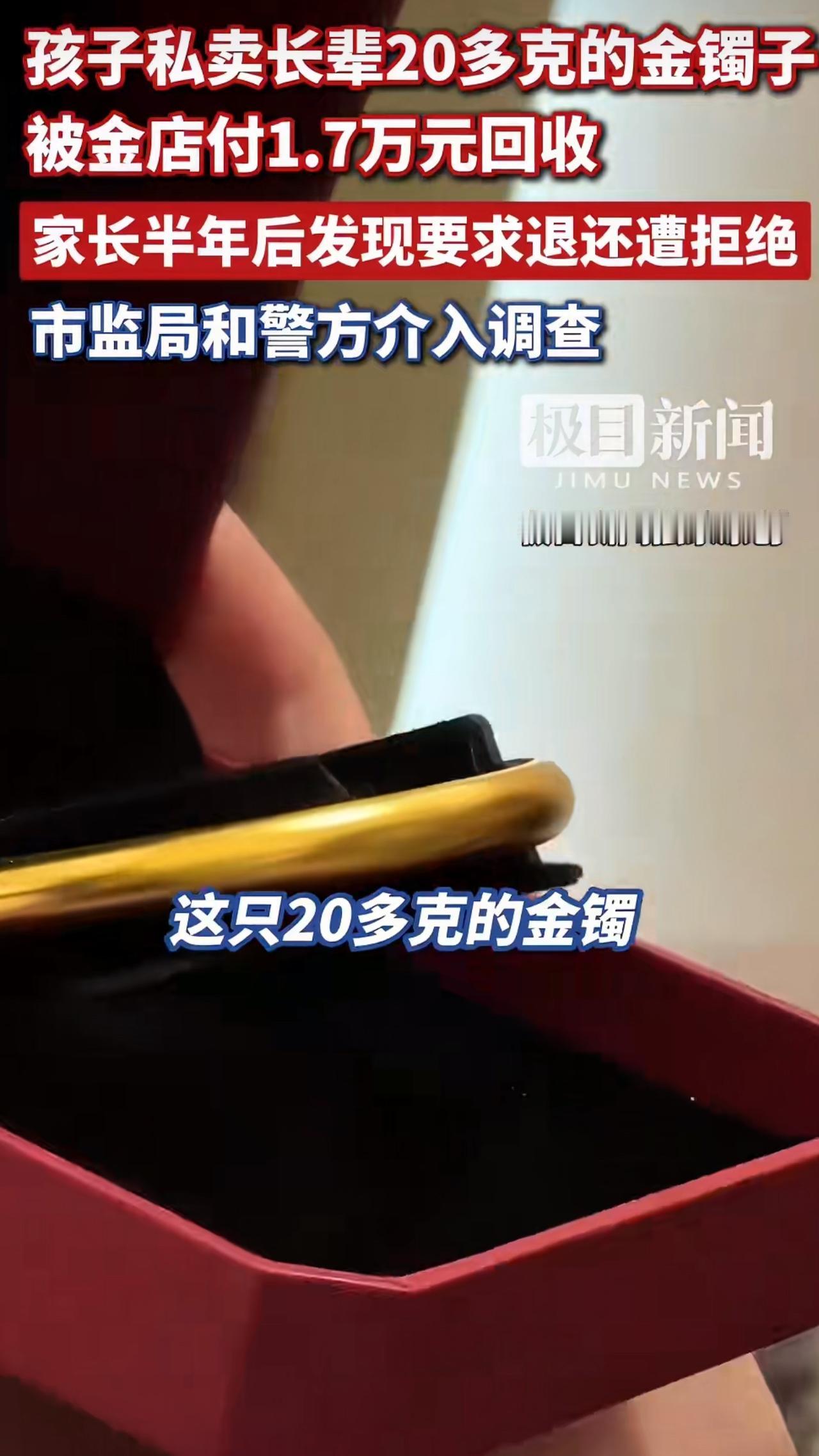 最陕西咸阳一个孩子偷偷把家里长辈的金镯子拿去卖了,家长发现后想找金店要回来,结果闹得不可开交,连市场监管部门和警方都介入了。 原来啊,这个孩子还没满16岁,平时家长可能没太注意,他居然悄悄把家里长辈戴的一个20多克的金镯子给拿走了。这孩子拿着镯子跑到泾阳金店,直接给卖了,金店当时也没多想,按当时的金价算了算,给了孩子差不多1.7万块钱,孩子拿了钱,估计也没跟家里说,这事儿就这么过去了。可谁知道,半年后家长收拾东西的时候,突然发现金镯子不见了!一问孩子,才知道早被卖掉了。家长一听就急了,这金镯子可是长辈的心头好,而且现在金价涨得厉害,同样的镯子现在能值3万左右呢!家长赶紧跑到金店,说想把钱退给金店,让金店把镯子还回来,可金店不干了,说镯子早就熔了重新加工,哪还能找回来?再说了,当时孩子卖镯子的时候,也没说不能卖啊。 家长一听更生气了,觉得金店没尽到审核义务,怎么能随便收未成年人的东西呢?双方在金店门口吵了起来,还引来了不少人围观,有人拍了视频发到网上,一下子就火了,有人说金店太黑心,有人说家长没管好孩子,还有人讨论这镯子到底该不该退。 其实啊,这事儿从法律上讲,还真有点复杂,孩子没满16岁,属于限制民事行为能力人,他卖贵重物品的行为,家长如果不认可,是可以要求撤销的,但金店要是能证明自己当时不知道孩子是未成年人,或者已经尽到了合理的审核义务,那可能就不用担责,可问题是,金店当时到底有没有问孩子要身份证?有没有问镯子是从哪来的?这些细节现在双方各执一词,谁也说不清楚。 市场监管部门和警方介入后,也开始调查这事儿,他们得查清楚金店当时的回收流程合不合规,孩子卖镯子的时候到底有没有隐瞒年龄,要是金店确实有问题,那可能得退钱或者赔偿;要是孩子和家长也有责任,那这事儿可能就没那么简单了。这事儿也给咱们提了个醒:家里要是有贵重物品,可得收好了,别让孩子随便拿到;金店回收贵重物品的时候,也得多个心眼,别光看钱不看人,万一惹上麻烦就得不偿失了。至于这镯子到底能不能要回来,咱们就等市场监管部门和警方的调查结果吧。偷金镯子 丢金镯子 孩子1.7万私卖金镯现值3万左右 事件来源:极目新闻