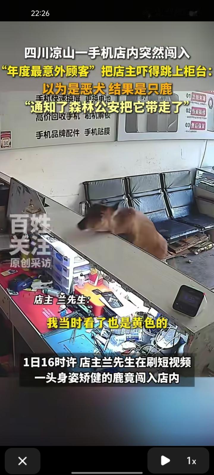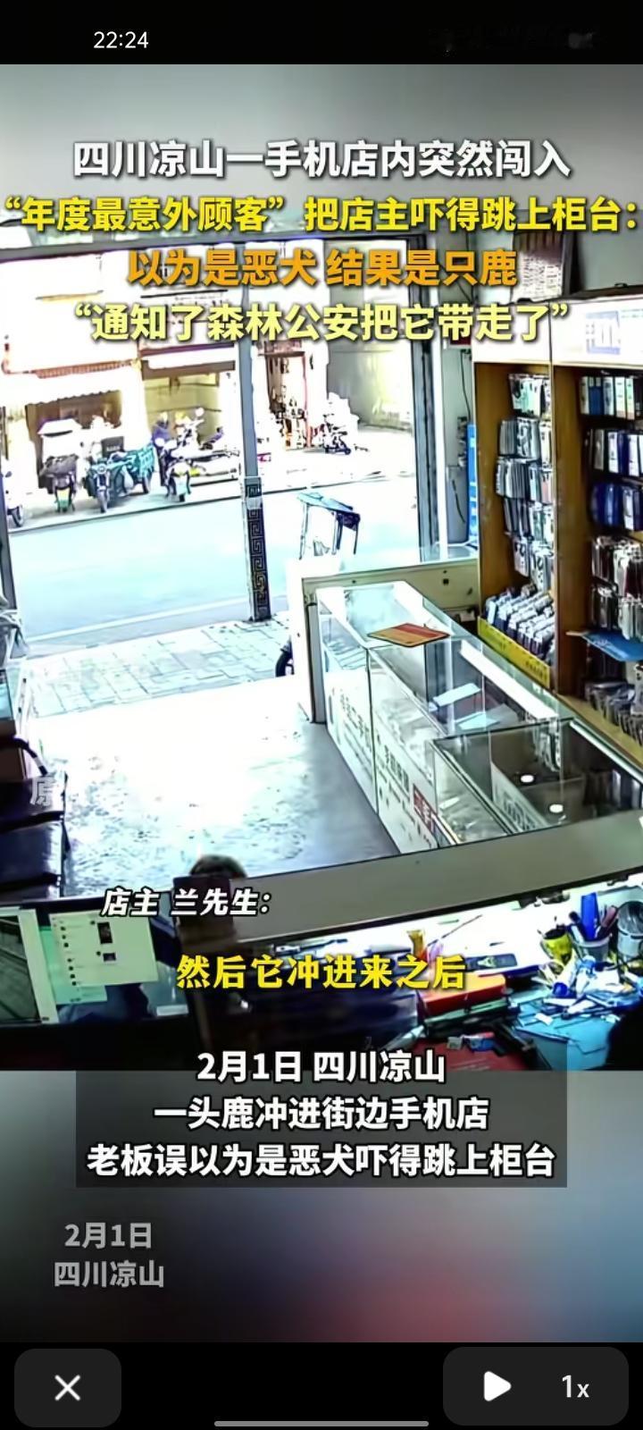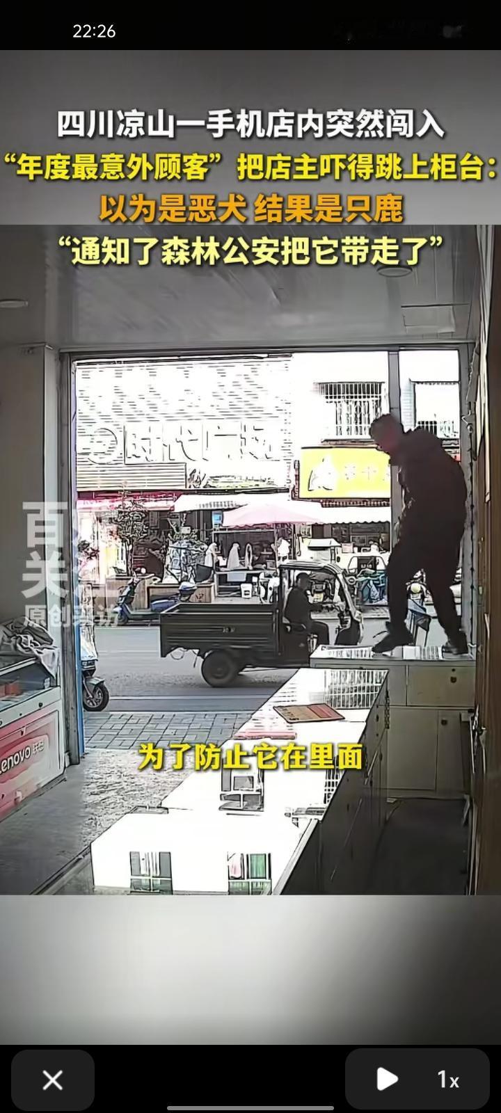 2月1日,凉山州越西县。一头鹿冲进街边手机店,店主误以为是恶犬,吓得跳上柜台避险。 店主兰先生表示,当时正在刷视频,看到一只黄色动物冲进来,以为是发了疯的狗,就赶紧跳上柜台。发现闯进店中的是一只麂后,怕它破坏店内物品,店主就将它拴了起来,目前这头麂已交由森林公安处理 一场虚惊,尽显日常里的小插曲与大智慧!麂子误闯小店,店主的第一反应是避险自保,发现真相后又妥善处置、转交相关部门,既护住了自己和店内财物,也为野生动物的保护尽了一份力。这小小的一幕也提醒着我们,生活里的突发状况无处不在,遇事不慌、先保安全,再找恰当的解决办法,便是应对意外最好的方式,而善待每一个不期而遇的小生命,更是藏在细节里的温柔与责任。