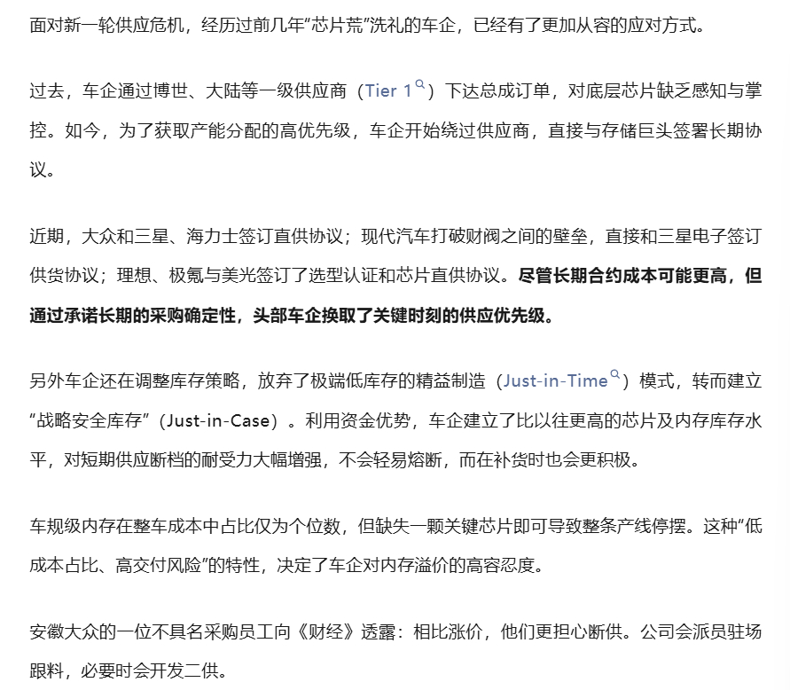 比如大众和三星、海力士签订直供协议;现代汽车与三星电子签订供货协议;理想、极氪与美光签订了选型认证和芯片直供协议。用长期采购确定性换取供应优先级。