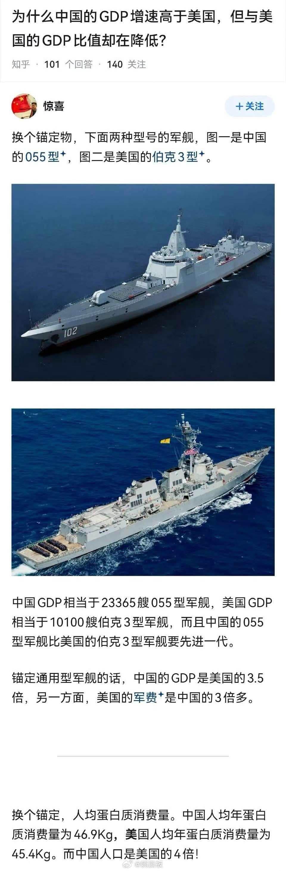 为什么中国的GDP增速高于美国,但与美国的 GDP比值却在降低? 这位网友拿军舰作对比,说的很有意思。 中国GDP相当于23365艘055型军舰,美国GDP相当于10100艘伯克3型军舰。 而且中国的055型军舰,比美国的伯克3型军舰要先进一代。 锚定通用型军舰的话,中国的GDP是美国的3.5倍,另一方面,美国的军费是中国的3倍多。 这种视角,试图绕开汇率和通胀的“货币幻觉”,强调实际产出、制造能力、硬实力对比。