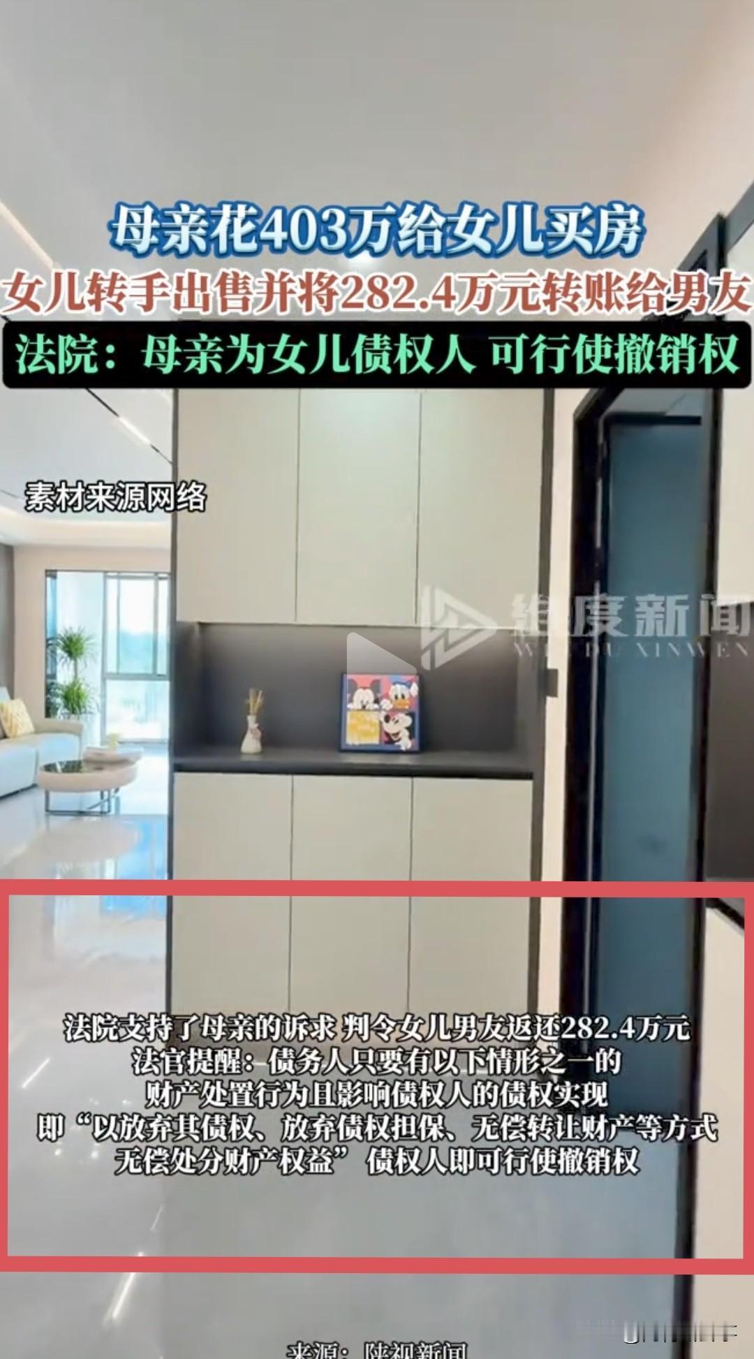 合肥这起案件刷新三观!母亲李某出资403万买两套房产,全登记在女儿赵某名下,女儿却偷偷卖掉一套,把282.4万卖房款全额转给男友,还签了无偿赠与协议 ! ✅ 关键细节藏不住: 1. 母亲早有防备,女儿当初写了两张欠条,明确403万是借款而非赠与 2. 女儿和男友分手后,母亲才知情,果断起诉维权 3. 法院二审认定:借款债权早于赠与,女儿无偿转款影响母亲债权实现,依法撤销赠与协议,判令男友全额返还 ! ❌ 恋爱脑真的会毁人! 为了讨好男友,把母亲半生积蓄当筹码,无视亲情和法律边界,幸好法律给了公道。提醒所有父母:给子女出资买房,一定要留好凭证(欠条、转账记录),避免后续纠纷。 你觉得女儿该被原谅吗? 母亲403万买房女儿卖掉送男友282万你怎么看
