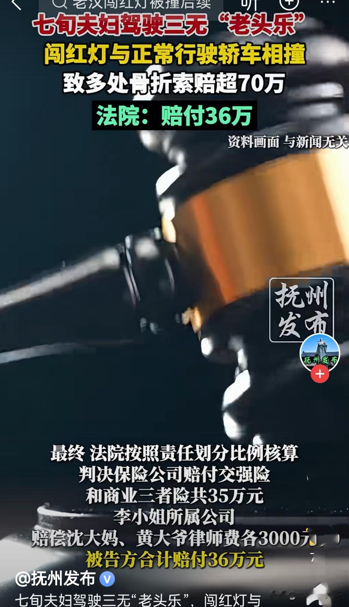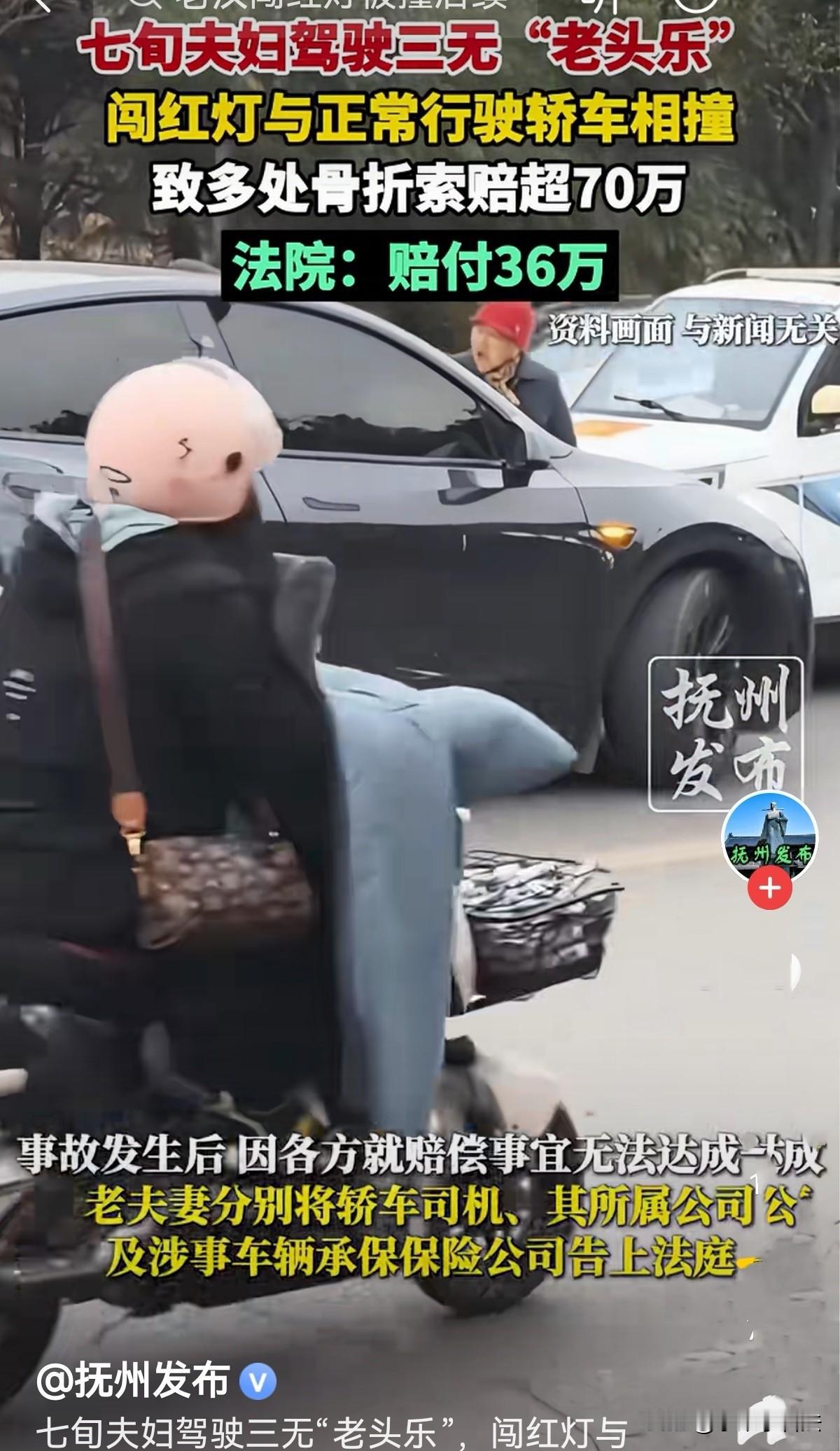 “老,有理了吗?”上海,一对七旬夫妇骑着老头乐闯红灯,与正常行驶的轿车相撞,致两个老人多处骨折。交警认定,大妈驾驶三无老头乐,还存在闯红灯行为,需承担主责。轿车司机绿灯通行未减速也存在过错。双方因赔偿问题无法达成协议,老人将轿车司机及其所属公司、涉事车辆承保保险公司告上法庭,索赔70多万元。最后法院判决意难平! 上海中山北一路广中路的路口,早高峰的车流刚过,阳光透过树叶洒在路面上。 68岁的沈大妈握着自家“老头乐”的方向盘,后座载着老伴黄大爷,两人打算去附近菜场买点新鲜蔬菜。 沈大妈琢磨着:开着这小电四轮灵活,不用排队,有空就能挤过去,从不耽误路程,比坐公交方便多了,回来时还能拉着菜,特别应手。 沈大妈自信满满,一路风驰电掣,黄大爷坐在后座直吆喝她慢一点!沈大妈不耐烦地说:坐着你得了,我心里有数,别指手画脚的! 走到路口时,信号灯已经开始闪烁,眼看就要变红,沈大妈脚下加了点电门,想趁着最后几秒冲过去。 她转头跟老伴念叨:得快点过,不然又要等半天!黄大爷还没来及阻止,沈大妈已脚踏电门,往前冲去。 就在这时,28岁的李小姐正驾驶着公司的轿车,沿着中山北一路正常行驶。 绿灯亮了,她踩着油门准备通过路口,心里还盘算着上午要处理的工作。因为路口视线良好,又是绿灯通行,她没刻意减速,没想到意外突然发生。 “砰”的一声巨响,沈大妈的“老头乐”径直撞上了轿车的右侧车门。 巨大的冲击力将“老头乐”撞翻,沈大妈和黄大爷瞬间被甩出老远,摔在地上疼得直哼哼。 李小姐吓得猛踩刹车,回头一看,老两口蜷缩在车下,脸色惨白,赶紧掏出手机报警又打了120。 送到医院检查后,结果让人心疼:沈大妈两段椎体压缩性骨折、左侧七根肋骨骨折,被评定为九级、十级伤残,需要长期护理;黄大爷更严重,左侧十根肋骨骨折,构成九级伤残。 躺在病床上,沈大妈又悔又气,悔的是不该闯红灯,气的是自己好好出门却遭了这罪;黄大爷则一个劲叹气,觉得自己无辜受牵连。治疗花了不少钱,后续康复还得花钱。 《道路交通安全法》第38条规定:车辆、行人应当按照交通信号通行;遇有交通警察现场指挥时,应当按照交通警察的指挥通行;在没有交通信号的道路上,应当在确保安全、畅通的原则下通行 。 经交警部门勘察现场,进行的责任认定,沈大妈驾驶的“三无老头乐”,并且她有闯红灯行为,此次交通事故沈大妈承担主责为50%,黄大爷未系安全带也要承担责任17%。 李小姐虽正常行驶,但绿灯通行未减速,存在过错,应承担33%的次要责任。 老两口和家人商量后,向李小姐提出了合计70多万的赔偿,其中沈大妈索赔43万,黄大爷索赔27万。 可李小姐觉得委屈,自己是绿灯正常行驶,主要责任在闯红灯的一方,公司也认为赔偿金额太高,双方谈了好几次都没谈拢。 没办法,沈大妈和黄大爷只好把李小姐、她所在的公司以及车辆承保的保险公司一起告上了法庭。 开庭时,老两口的律师说,沈大妈虽闯红灯有过错,但李小姐未减速增加了事故伤害程度,理应承担相应责任; 而被告方则辩称,沈大妈驾驶无牌照、无驾照、无保险的“老头乐”上路,还闯红灯,是事故的主要原因,李小姐的责任有限。 法院审理后,采信了交警的责任认定,认为老两口的诉求中合理部分应当支持,但二期治疗相关的营养费、护理费等,结合实际伤情和恢复情况,没有全部认可。 《民法典》第1213条规定:机动车发生交通事故造成损害,属于该机动车一方责任的,先由承保机动车强制保险的保险人在强制保险责任限额范围内予以赔偿;不足部分,由承保机动车商业保险的保险人按照保险合同的约定予以赔偿;仍然不足或者没有投保机动车商业保险的,由侵权人赔偿 。 最终判决下来,保险公司赔付交强险和商业三者险共35万元,其中沈大妈21万,黄大爷14万。 李小姐所属公司赔偿两人律师费各3000元,合计6000元。算下来,被告方一共赔偿36万元。 有人说,闯红灯全责,不是年龄大小的问题。不能倚老卖老! 有人意难平:按交通法论事,无牌无路权、闯红灯出事故的车及其车主,就该是全责,正常行驶的车及车主就不应该赔偿。 对此,您觉得该不该赔偿呢?