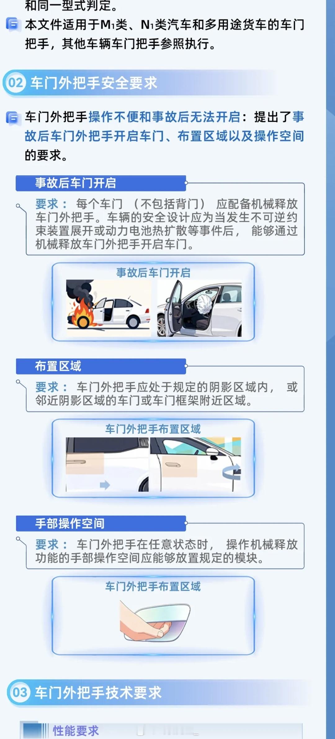 在发生电子系统失效的情况下,要确保人力操作就能开启车门(明确不需要工具,感觉以后像弹出式门把手等成本会越高,标准测试难度越大)