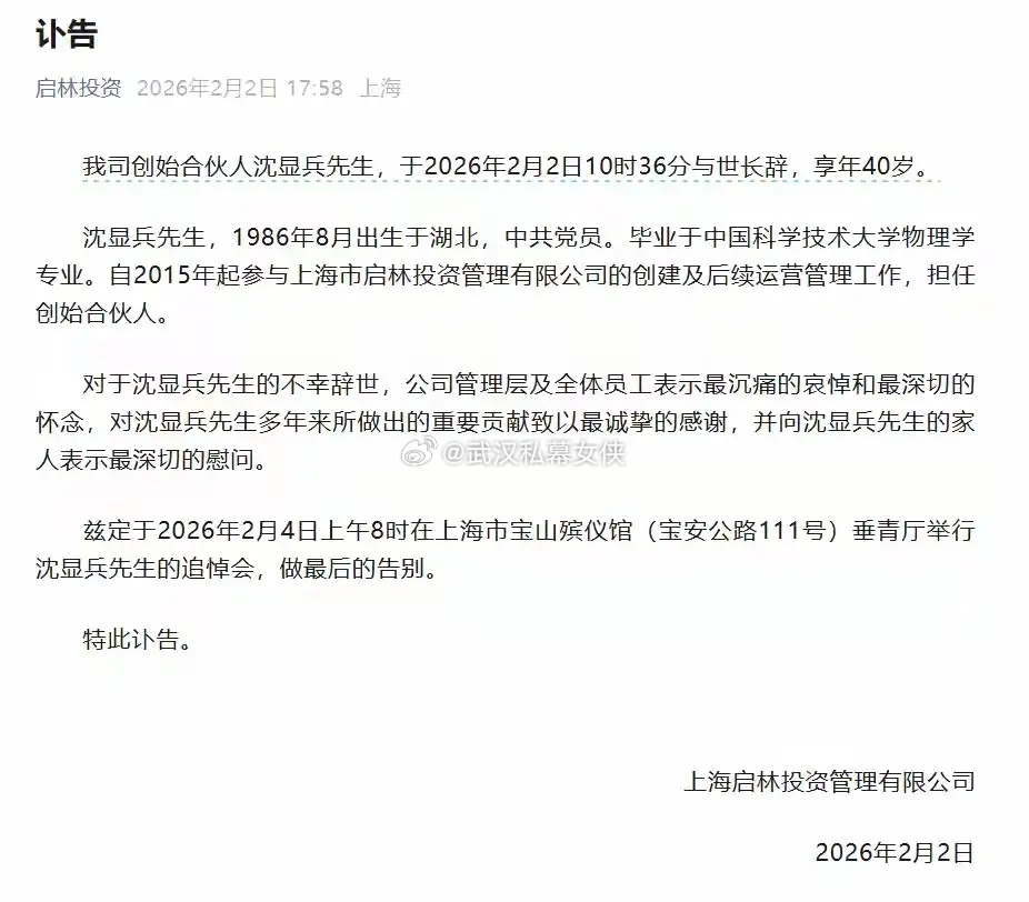 近日,百亿级私募启林投资发布公告称,公司创始合伙人沈显兵先生,于2026年2月2日10时36分与世长辞,享年40岁。