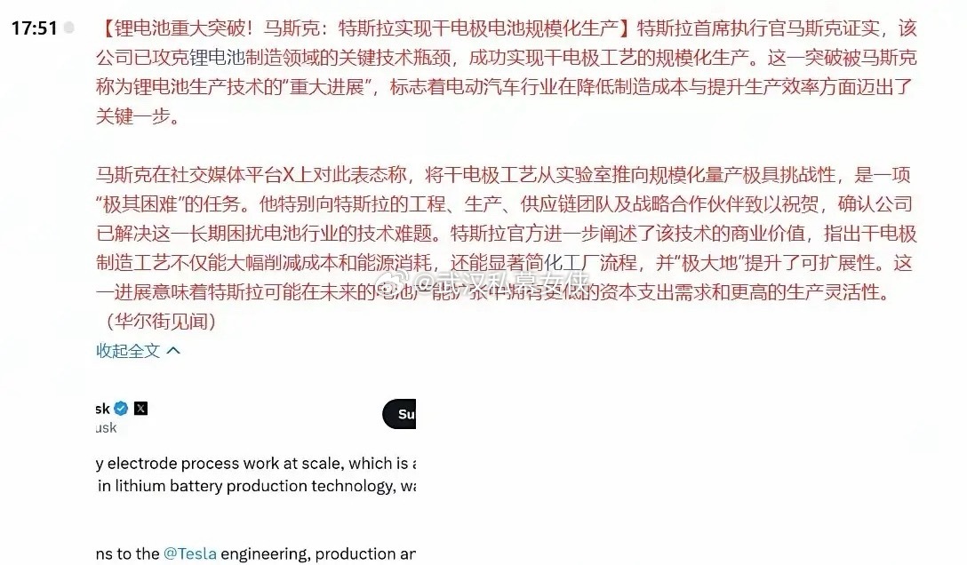 明天估计这一板块要起飞!特斯拉宣布实现干电极电池规模化生产,这一技术突破被称为锂电池领域的“重大进展”,核心优势在于大幅降低制造成本、简化生产流程、提升能源利用效率与产能扩展性。该事件将直接带动干电极产业链的材料、设备、结构件等环节需求爆发,短期具备强烈情绪催化,中长期则开启锂电产业技术升级的新周期。受益概念股梳理分析1. 璞泰来:锂电材料龙头,布局干电极专用粘结剂与复合铜箔,技术深度适配特斯拉需求,受益于干电极规模化生产,订单增长明确,具备长期成长属性。2. 天奈科技:碳纳米管导电剂全球龙头,产品适配干电极工艺以提升导电效率,技术壁垒高,受益于特斯拉供应链拓展,业绩弹性充足。3. 先导智能:锂电设备核心企业,提供干电极涂布与成型设备,技术实力突出,受益于特斯拉产能扩张,订单增长确定性强,获机构持续关注。4. 杉杉股份:锂电材料核心企业,布局干电极导电剂与硅基负极材料,技术适配性强,受益于产业趋势,订单增长明确,具备成长属性。5. 中科电气:负极材料龙头,研发适配干电极的高容量硅基负极,技术壁垒高,受益于特斯拉技术升级,业绩弹性充足,资金关注度高。6. 赢合科技:锂电设备核心企业,布局干电极产线整线装备,技术适配性强,受益于产能扩张,订单增长潜力大,具备成长属性。7. 恩捷股份:湿法隔膜龙头,同步布局干法隔膜适配干电极工艺,技术壁垒高,受益于特斯拉供应链拓展,业绩稳健具备防御性。8. 星源材质:干法隔膜核心企业,产品直接适配干电极需求,技术实力突出,受益于产业趋势,订单增长弹性充足,获资金认可。9. 宁德时代:动力电池全球龙头,储备干电极技术并推进产业化,受益于行业技术升级,供应链协同效应强,业绩确定性高。10. 容百科技:正极材料龙头,研发适配干电极的高镍三元正极,技术壁垒高,受益于特斯拉技术迭代,业绩弹性充足,获机构关注。11. 当升科技:正极材料核心企业,布局干电极适配的高电压正极材料,技术适配性强,受益于产能扩张,订单增长明确。12. 科达利:电池结构件龙头,提供干电极电池专用壳体与盖板,技术适配特斯拉需求,受益于产能扩张,业绩稳健具备成长属性。13. 嘉元科技:铜箔核心企业,研发复合铜箔适配干电极工艺以提升能量密度,技术壁垒高,受益于特斯拉供应链拓展,订单增长弹性充足。14. 诺德股份:铜箔核心企业,布局复合铜箔技术适配干电极需求,技术实力突出,受益于产业趋势,获资金持续关注。15. 杭可科技:锂电设备核心企业,提供干电极后段处理设备,技术适配性强,受益于产能扩张,订单增长明确,具备成长属性。16. 国轩高科:动力电池核心企业,储备干电极技术并推进量产,适配新能源汽车需求,受益于行业技术升级,订单增长潜力大。17. 中材科技:锂电隔膜核心企业,布局干法隔膜技术适配干电极需求,技术实力突出,受益于产业趋势,具备防御性与成长属性。18. 科恒股份:锂电设备核心企业,布局干电极涂布与烘干设备,技术适配特斯拉需求,受益于产能扩张,订单增长明确。19. 比亚迪:动力电池核心企业,研发干电极相关技术适配自研车型,受益于产业趋势,订单增长明确,具备龙头属性。20. 翔丰华:负极材料核心企业,研发适配干电极的人造石墨负极,技术适配性强,受益于特斯拉供应链拓展,业绩弹性充足。总结特斯拉干电极电池的规模化生产,标志着锂电产业技术升级进入实质性落地阶段,将直接带动材料、设备、结构件等全产业链需求爆发。短期情绪催化明确,中长期产业趋势确定性强,建议优先选择技术壁垒高、订单明确的龙头标的,规避纯题材炒作,把握产业升级带来的结构性机会。