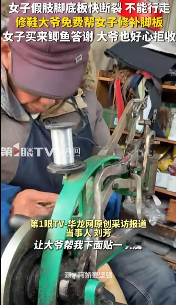 一句“听我的”戳中无数人!2月2日江苏无锡。女子假肢脚底板快断裂,不能行走。修鞋大爷免费帮女子修补脚板,女子买来鲫鱼答谢,大爷却朴实拒收。 视频里清晰看到,女子拖着那只脚底板快裂透的假肢,一步一挪走到街边修鞋店,跟守摊的大爷轻声说明情况,想让大爷帮忙补一补。她说这假肢换个新的要一万多块,实在舍不得花这笔钱,就想简单补加固下,能防止彻底断裂凑合用就好。大爷听后没多问一句,接过假肢就忙活起来,翻出耐磨的胶皮,拿着针线一针一线仔细缝补、牢牢加固,忙活了好一阵子,才把快坏的假肢修好。 女子接过修好的假肢,赶紧问大爷要付多少手工费,可大爷看着她的假肢,满脸都是心疼,一个劲摆手直说不收钱,嘴里还念叨着姑娘看着就不容易,这点小事根本不值当提钱。女子心里过意不去,总觉得不能白受大爷的恩惠,刚好要去旁边菜市场买菜,就特意挑了一条鲜活的鲫鱼,拎着又折回了修鞋店,硬要把鱼塞给大爷。可大爷依旧不肯收,把鱼又推回女子手里,带着点执拗又温柔的语气,就说了三个字:“听我的。” 没有华丽的辞藻,没有刻意的煽情,就是这样简单的一幕,却让人心里暖烘烘的。大爷不过是个靠修鞋手艺讨生活的普通人,挣的都是辛苦钱,可看到别人的难处,却能二话不说伸出援手,不求任何回报;女子身处不易,却始终记着别人的好,想着用最朴实的方式表达感谢,这份互相体谅的心意,格外动人。 我们总说生活不易,可在这人间烟火里,总有这样的小美好和小温暖,悄悄治愈着我们。有人觉得现在的人情越来越淡,可无锡这位修鞋大爷的举动告诉我们,最纯粹的善良从来都藏在身边,它不是什么轰轰烈烈的大事,就是见人难时搭把手,是力所能及的体谅,是不求回报的真心。这份藏在街头巷尾的善意,不掺任何杂质,比所有精致的客套都更戳心。 各位读者你们怎么看?欢迎评论区讨论。