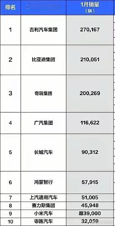 新能源汽车购置税一收,补贴一停。这新能源汽车销量果然就下来了。作为新能源一哥的比亚迪,一月份销量21.01万台。同比下降超30%。环比下降超50%。而且国外销量还有10.05万台,也就是国内销量只有10.96万台。说是销量腰斩都是高估比亚迪的销量了吧。再看吉利汽车靠着燃油车销量14.59万辆,再加上12.43万辆的新能源,在销量上超过了比亚迪。不知道比亚迪当初放弃纯燃油市场有没有后悔。再看已经发布销量的新能源,问界40016台,零跑32059台,小米39000台。对比上个月全都在下滑。而那些没发布销量的估计会更惨吧。