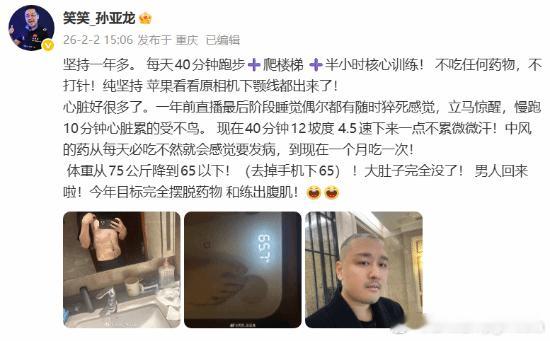 孙亚龙晒近照:坚持锻炼一年多 中风的药吃的也少了今日,知名主播、前职业选手孙亚龙在微博分享了自己的近况,曾确诊中风的他如今坚持了一年多的锻炼,大肚子没了,吃药也少了。他本人为自己设定了目标:今年目标完全摆脱药物和练出腹肌原文如下:“坚持一年多。每天40分钟跑步+爬楼梯+半小时核心训练!不吃任何药物,不打针!纯坚持苹果看看原相机下颚线都出来了!心脏好很多了。一年前直播最后阶段睡觉偶尔都有随时猝死感觉,立马惊醒,慢跑10分钟心脏累的受不鸟。现在40分钟12坡度 4.5速下来一点不累微微汗!中风的药从每天必吃不然就会感觉要发病,到现在一个月吃一次!体重从75公斤降到65以下!(去掉手机下65)!大肚子完全没了! 男人回来啦!今年目标完全摆脱药物和练出腹肌!”