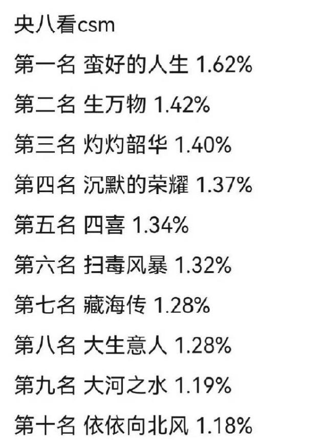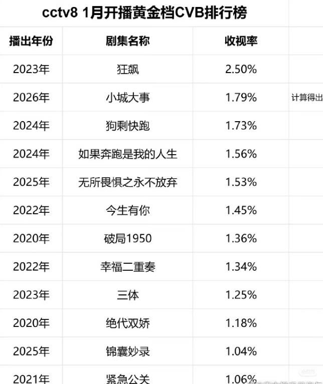 《小城大事》CVB平均收视率已出! 央视收视日历发布,《小城大事》收视率1.794%,还是有点可惜,差一点就1.8%了,央八CVB历史上一月份播出的所有剧集中排名第二,仅次于《狂飙》,第三是《狗剩快跑》,收视率1.73%,《生命树》有望和《狗剩快跑》争夺第三的成绩。