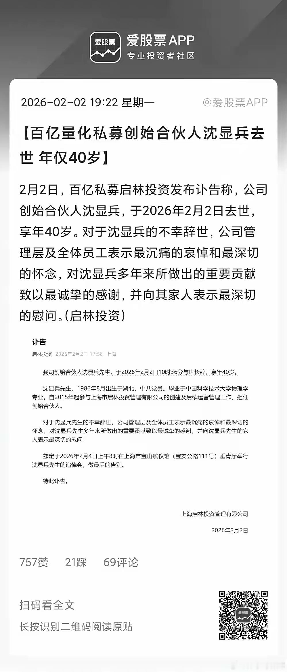 百亿量化私募启林投资合伙人沈显兵去世,享年40岁,确实很年轻啊!