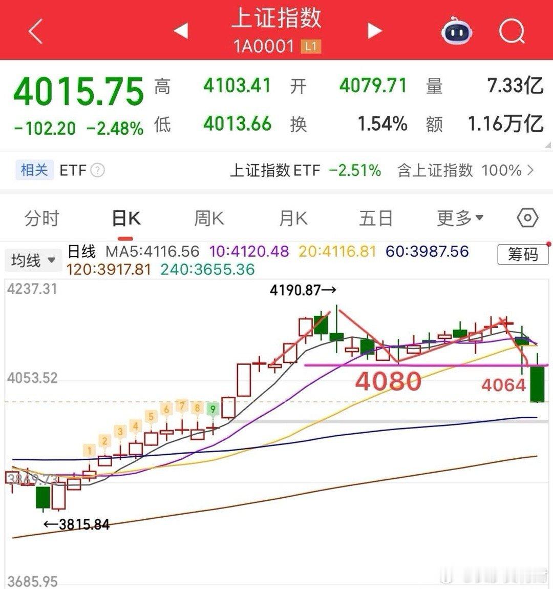 2026.2.2周一收评: 百点跌幅+百股跌停,贵金属带崩市场情绪。 2月份开局就来了一闷棍,三大指数全线下跌,后续该怎么看?今天大盘很明显受黄金,白银的影响,牵一发而动全身,带崩了整个市场,今天这个行情基本上没有办法,情绪单边宣泄的一天。 技术面看,大盘大幅低开后一路震荡向下,跌破了4034关键点,差不多最低点收盘,收了根光脚阴线,说明空头力量还不小,调整还没有结束的迹象。不过,从均线的角度来看,5日线有一定的偏离,明天惯性低开后,若继续下探,大概率会有一个回拉反弹的动作,第一道压力先看4064,再看4080,注意过不去就还会弱势震荡,下方支撑看60日线和缺口附近支撑。 从情绪角度看,上周个股调整了一周,周末受利空影响,再次打到冰点,越是这个时候越要理性,别慌,躺也得躺着,要等修复再做去留。 春节前还剩下两周时间,基本上指数不要有太大的预期,即使有反弹,也是当作区间震荡的一部分,还是重个股为主,且控制一定仓位,切勿上头。 个人观点,仅供参考!