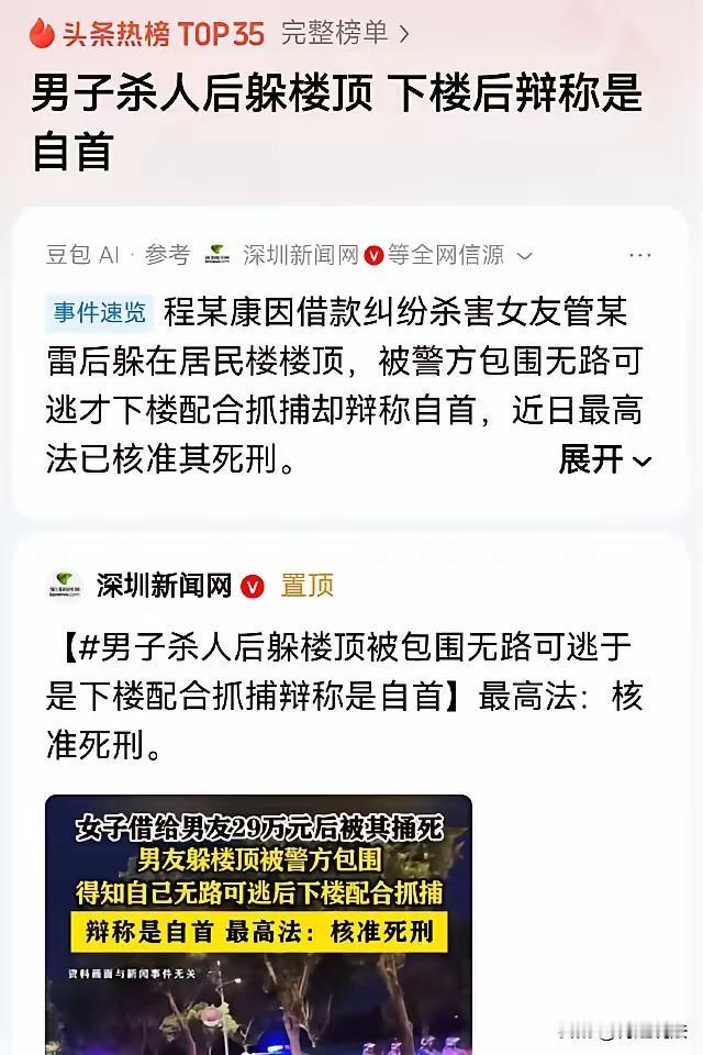 这起案件反映了复杂的人性、法律规定与司法审判的关系。以下是对案件的重点分析: 一、案件概述 犯罪事实: 男子程某某通过谎称创业,骗取女友管某某29万元,实则用于赌博,构成诈骗。 在关系破裂后,程某某与女友争吵升级,情绪失控,用刀刺伤她10余下,导致其当场死亡。 事后,程某某试图逃避责任,藏匿在居民楼顶部,最终被警方包围抓捕,并如实供述其犯罪。 法律认定: 程某某的行为构成故意杀人罪。 其在案发现场被警方包围无路可逃,表现为被动配合抓捕,不符合“自动投案”的法律定义。 最终被判死刑,已执行。 二、关于“投案自首”的法律问题 《最高法关于处理自首和立功具体应用法律若干问题的解释》明确,投案自首应是犯罪嫌疑人在未被查明、未被采取强制措施之前,主动投案,表达悔意,主动接受追究。而被警方“层层包围”之后下楼配合抓捕,不符合“主动投案”的法律界定。 在本案中: 程某某是在被警方快要抓获时,主动下楼配合抓捕,这属于被动配合。 他在被警方包围、无路可逃的情况下选择下楼,不能视为“自动投案”。 他的辩解称“投案自首”不成立,也不影响对其故意杀人罪的判决。 三、量刑分析 由于犯有故意杀人罪,按照法律应从严惩处。最高法院已核准判决,判处死刑,剥夺政治权利终身。 若行为符合自动投案、自首条件,可依法从轻或减轻处罚,但本案不具备这样的情节。 四、社会反响与法律公正 该案件体现了法律面前人人平等、依法办事的原则。犯罪行为严重,社会危害巨大,刑罚严厉是对受害者及社会正义的维护。 五、建议 被害人家属和公众应理解法律对严重犯罪的零容忍态度。 犯罪嫌疑人在合法范围内主动接受法律制裁,亦应依法给予应有的评判。 法律界和公众应正确理解“投案自首”的定义,避免因“被动配合”误解为“主动投案”。 总结:程某某因诈骗、故意杀人行为,虽然在案发后配合警方,但并不符合“投案自首”的法律定义,其刑罚判决合乎法律规定,故不影响其应承担的法律责任。以案件判决解读 命案解析