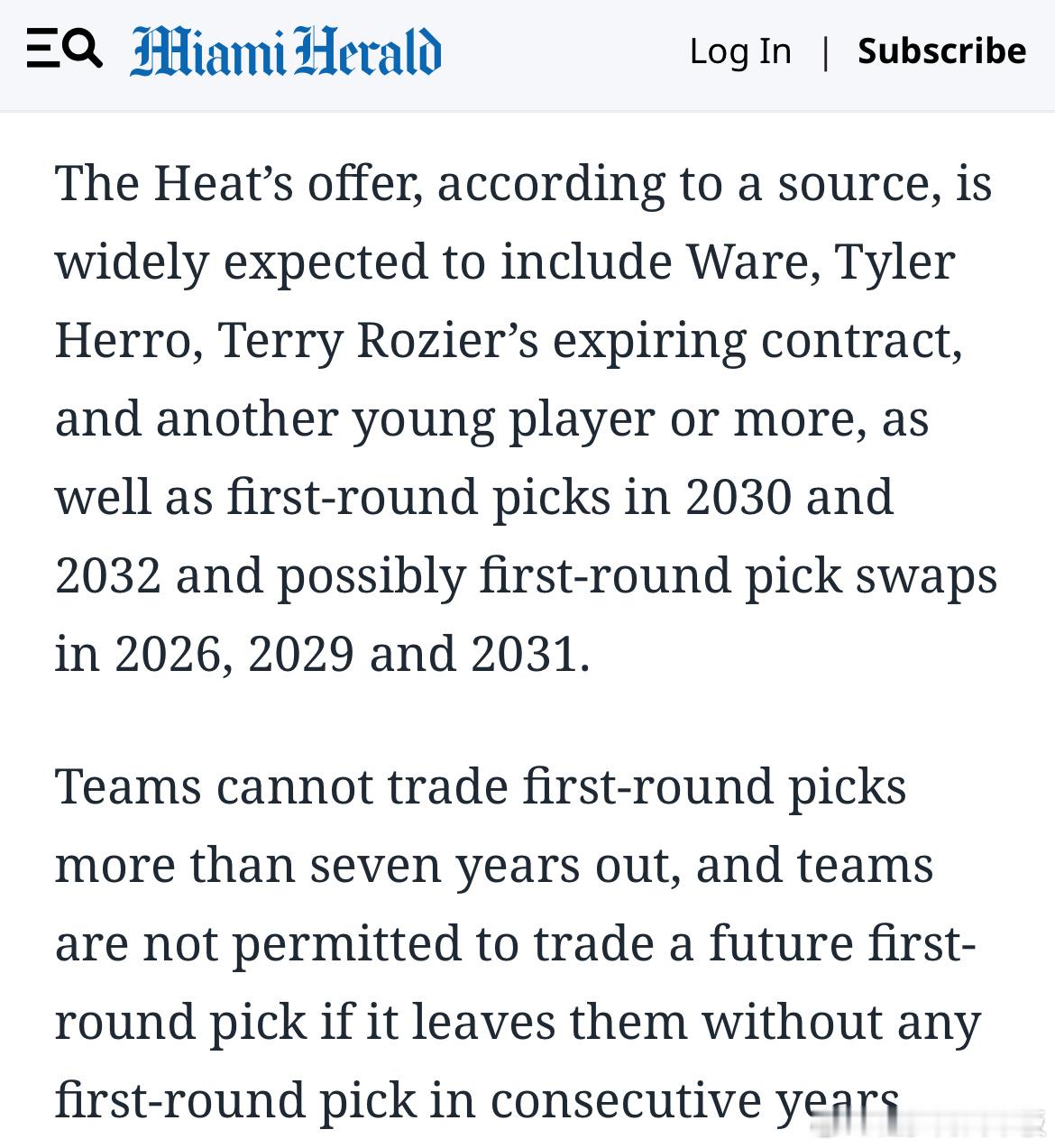 热火记者Barry:据一位消息人士透露,热火为字母哥所提供的报价包括凯尔-维尔、泰勒-希罗、罗齐尔到期合同、另一名年轻球员,以及2030、2032首轮签,2026、2029、2031年首轮互换权。