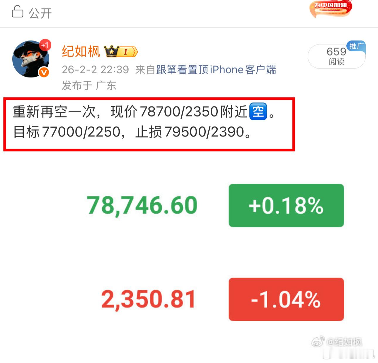 重新再空一次,现价78700/2350附近🈳。目标77000/2250,止损7