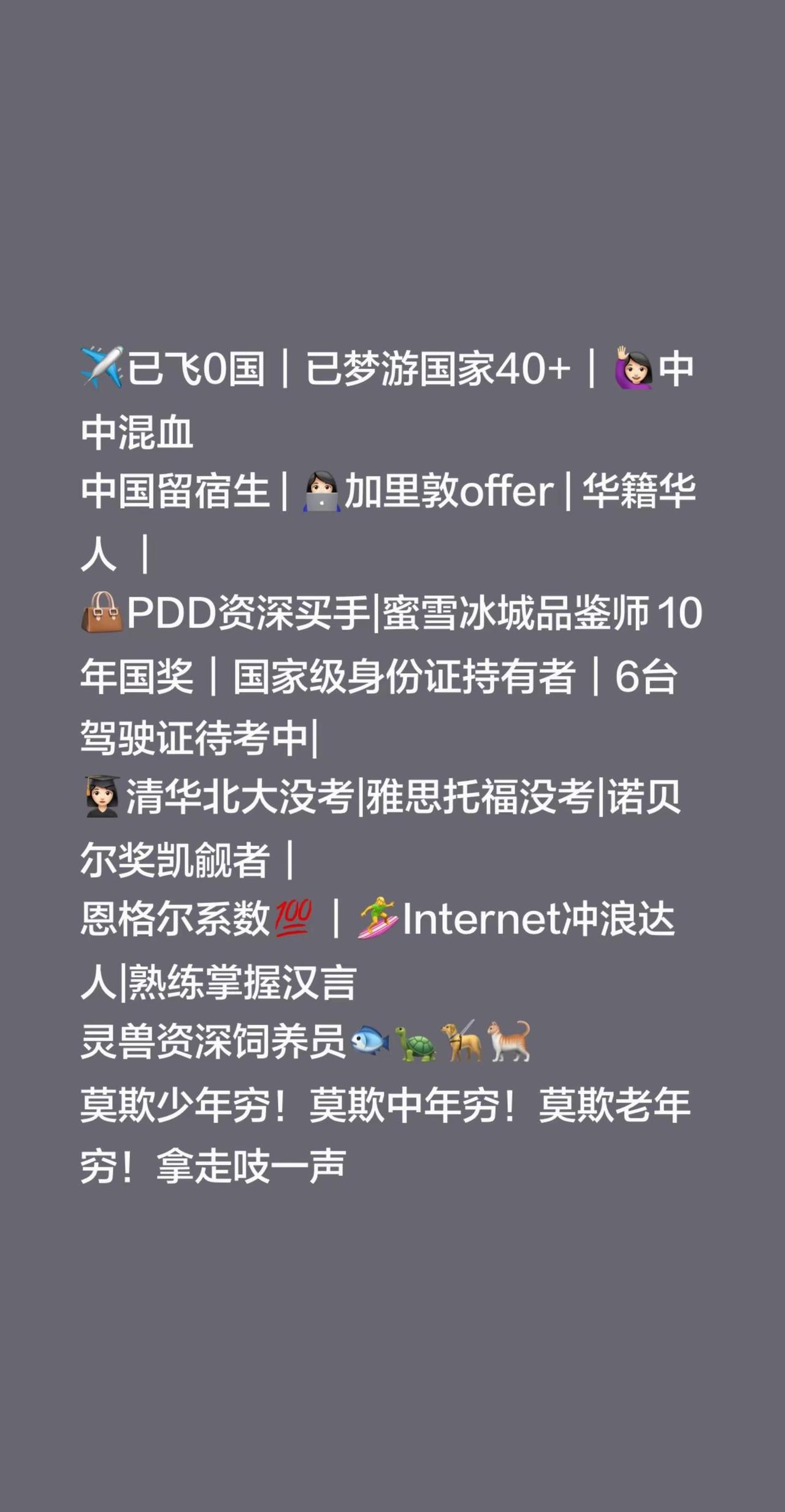我评论了@🌈刘小亿🐸吃喝玩乐 的作品:✈️已飞0国|已梦游国家40+|🙋🏻♀️中中混血中国留宿生 | 👩🏻💻加里敦offer | 华籍华人 |👜PDD资深买手|蜜雪冰城品鉴师 10年国奖|国家级身份证持有者|6台驾驶证待考中|👩🏻🎓清华北大没考|雅思托福没考|诺贝尔奖凯觎者|恩格尔系数💯|🏄♀️Internet冲浪达人|熟练掌握汉言灵兽资深饲养员🐟🐢🦮🐈莫欺少年穷!莫欺中年穷!莫欺老年穷!拿走吱一声