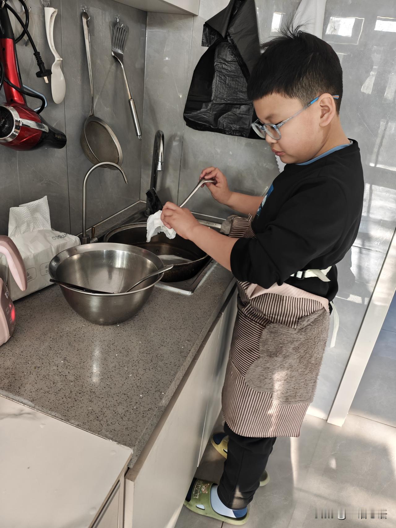 不是不会,是你根本没有给他机会。 大外孙假期家务指导第一课:洗碗。 先把碗用洗洁精清理擦拭一下,然后,用清水冲洗干净,最后,用干净的面巾把碗内外擦干。 刚开始,手连碗都抓不住,后来,越来越熟练,果然,手是越用越灵活。 看看劳动成果,碗洗得干干净净,成就感满满。 外孙子说,洗碗好累,姥姥天天做饭又洗碗真的好辛苦。 洗了一次碗,就体会到了家长的不易,这小子悟性不低。 我觉得常干家务,比孩子们上什么感恩课要强得多。