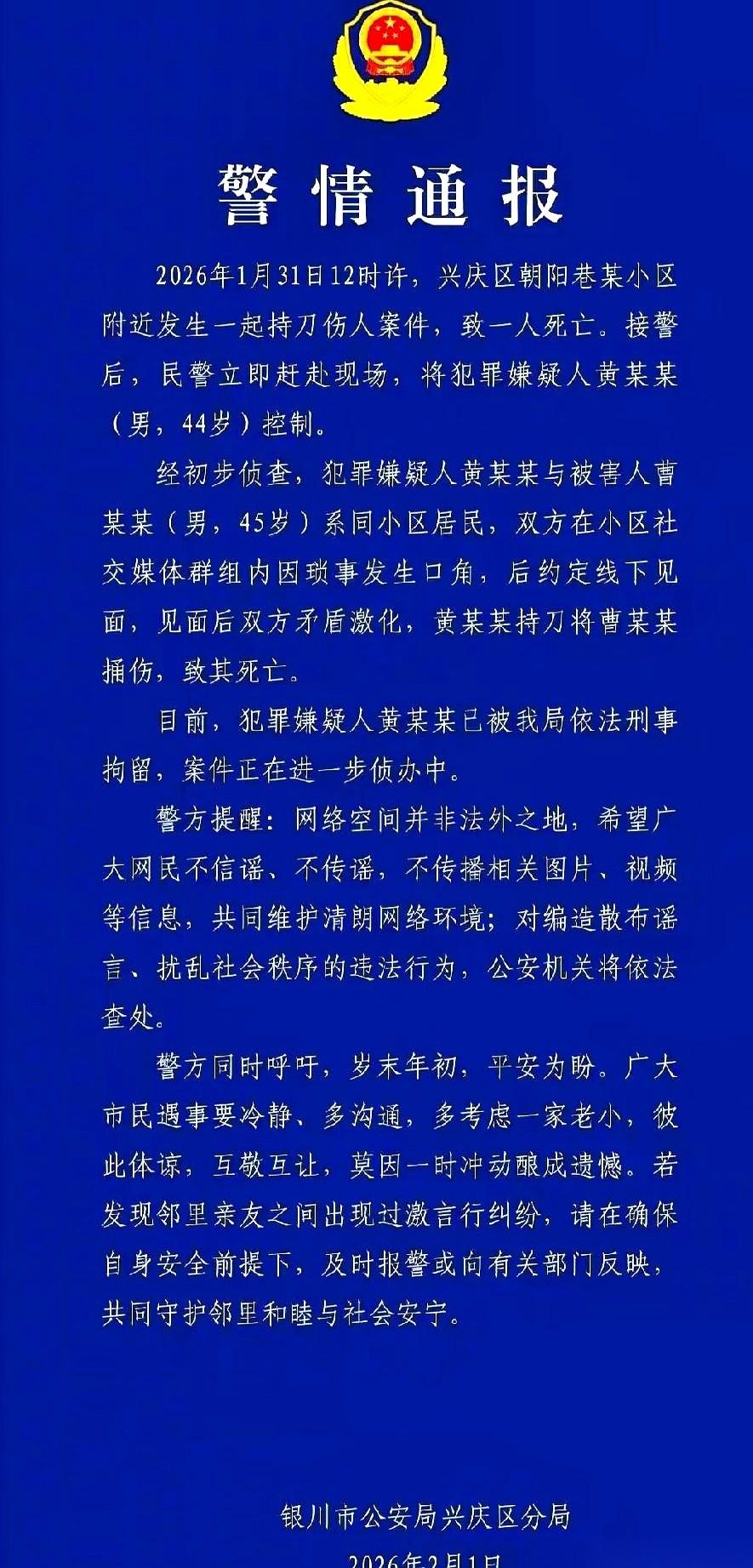 就因为在小区群里吵了几句嘴, 楼下,一个人把另一个人捅死了。 我到现在手都是凉的。 两个大男人,多大点事儿啊?值得你死我活? 线上对喷不解气,还非要约到楼下“真人快打”。 结果呢?一个奔黄泉,一个奔铁窗。 两个家庭,瞬间就塌了。 说白了,就是那点破面子。 网上吵架,谁也不服谁,都觉得自己是天王老子,键盘敲得山响。 下了网线,那股“气”还没卸下来,非要在线下分个高下。 最让人发冷的是什么? 是那个带了家伙的人。 这说明他出门的时候,就已经把“解决问题”的选项,换成了“解决掉人”。 怒火上头的那一刻,他不是在吵架,他是在玩命。 各位,真的,咱都是普通人,过日子的。 网络不是法外之地,现实更不是丛林。 别为了一时之气,赌上一辈子。 隔着屏幕能要你命的,从来不是那几句难听的话,是你自己的脾气。