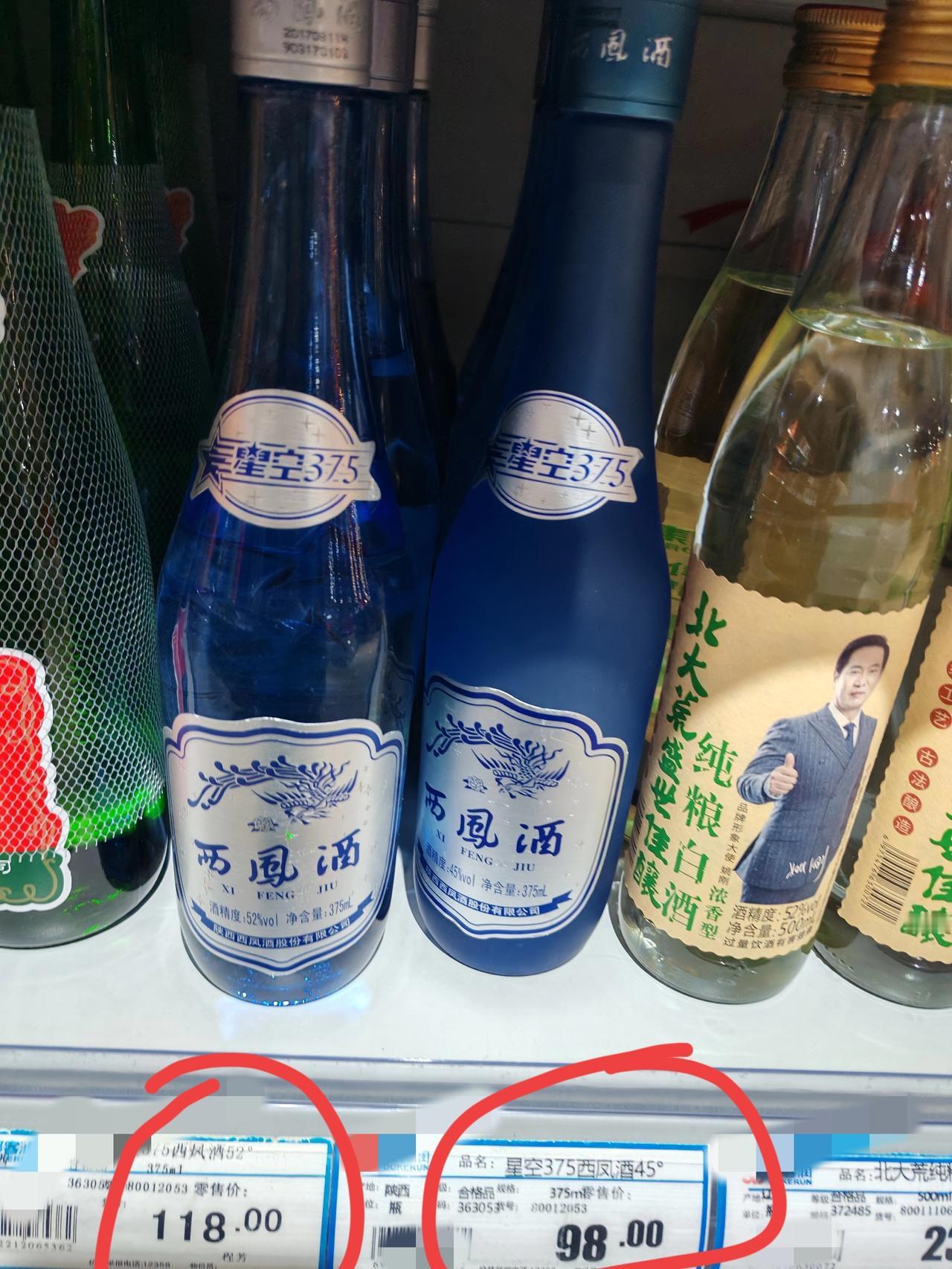 西凤酒家族又添新成员 2月3日,这是我昨天在西安的一处超市拍摄的几张图片,发现西凤酒有新动作了。 我家经常买酒,所以每次去超市我都要去酒水专柜小逛一下,以前见到的大多是西凤30年,20年,10年,6年年份酒,再就是红西凤,华山论剑系列,偶尔也见绿脖子西凤这类的口粮酒。 昨天发现西凤洒出了迷你装,这个以前没见过,就是图一这种125mI的,售价15元,这跟二锅头是一个路线,迷你装相对便宜,走亲民路线,适用于偶尔喝点小酒的人。 另外,我发现西凤酒业还出了一种星空375,见图二,蓝色的包装,这个系列有两种规格,一种52度的,一种45度,均为375mI,分别售价为118元,98元。 这个价位中规中矩,不算很贵,也不便宜,包装看着很浪漫,第一次注意到,不清楚喝起来口感如何,到底值不值得购买?你们注意到了吗?老酒精们谈一谈体验感呗。