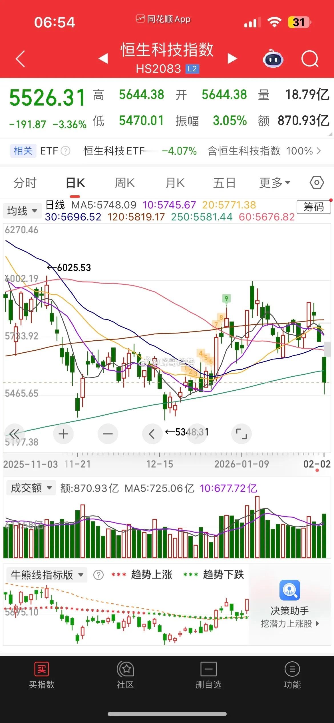 昨天市场全线杀跌,超百股跌停,三大指数均跌超2%,并击穿30日均线,科创50更是大跌近4%,沪指再度失守4100,直逼下方缺口3980,而内资跑了1100多亿,两市缩量2500多亿,目前总成交额维持在2.6万亿左右,短线情绪退潮明显,不过在经历连续几天的下杀风险释放后,市场短期存在一定修复预期,板块上昨天电网设备、白酒逆市活跃,贵金属、半导体全线重挫,机器人、商业航天、Al应用延续调整,现在看市场要想弱转强,打出人气信心,还得靠前期的热门小登科技来带,也就是商航、半导体、Al应用等,还有贵金属有色,解铃还需系铃人。