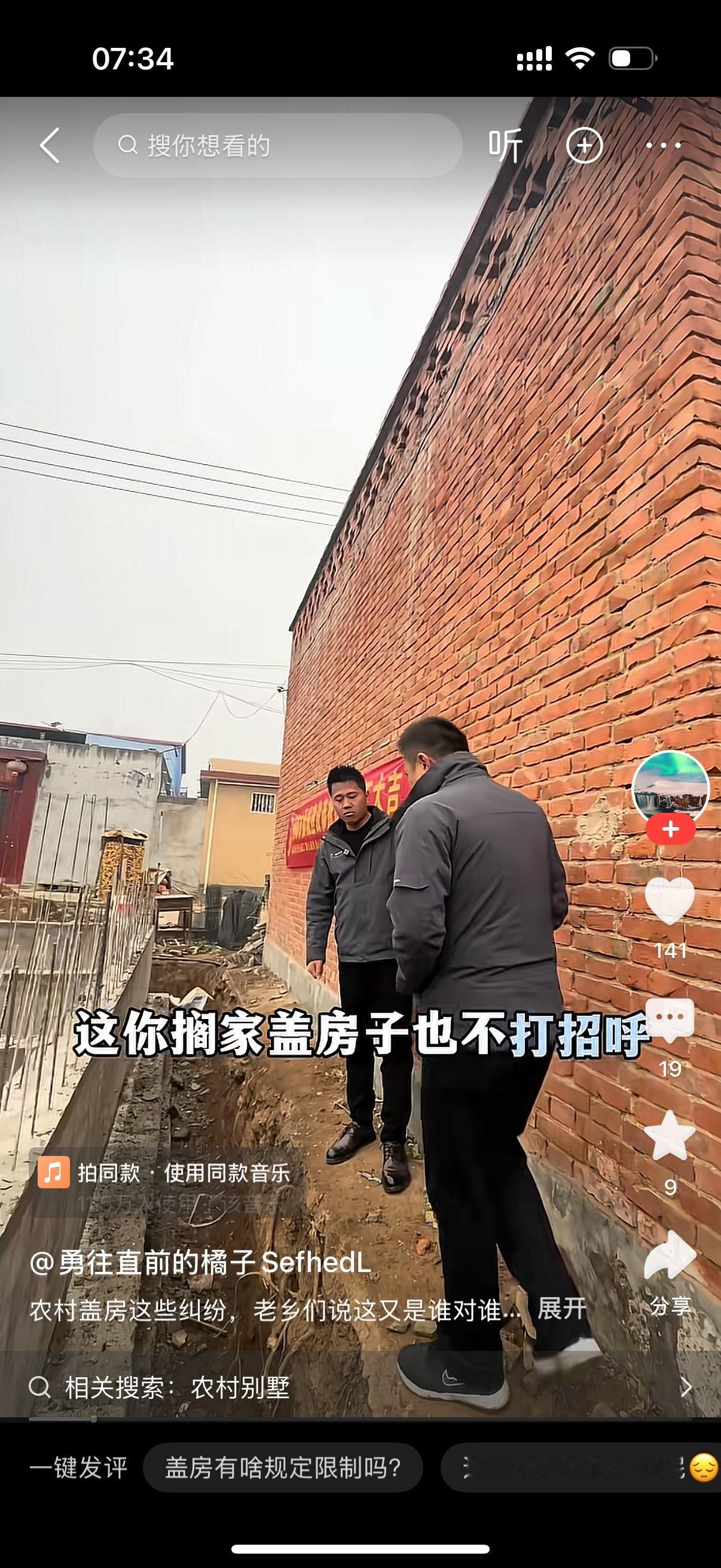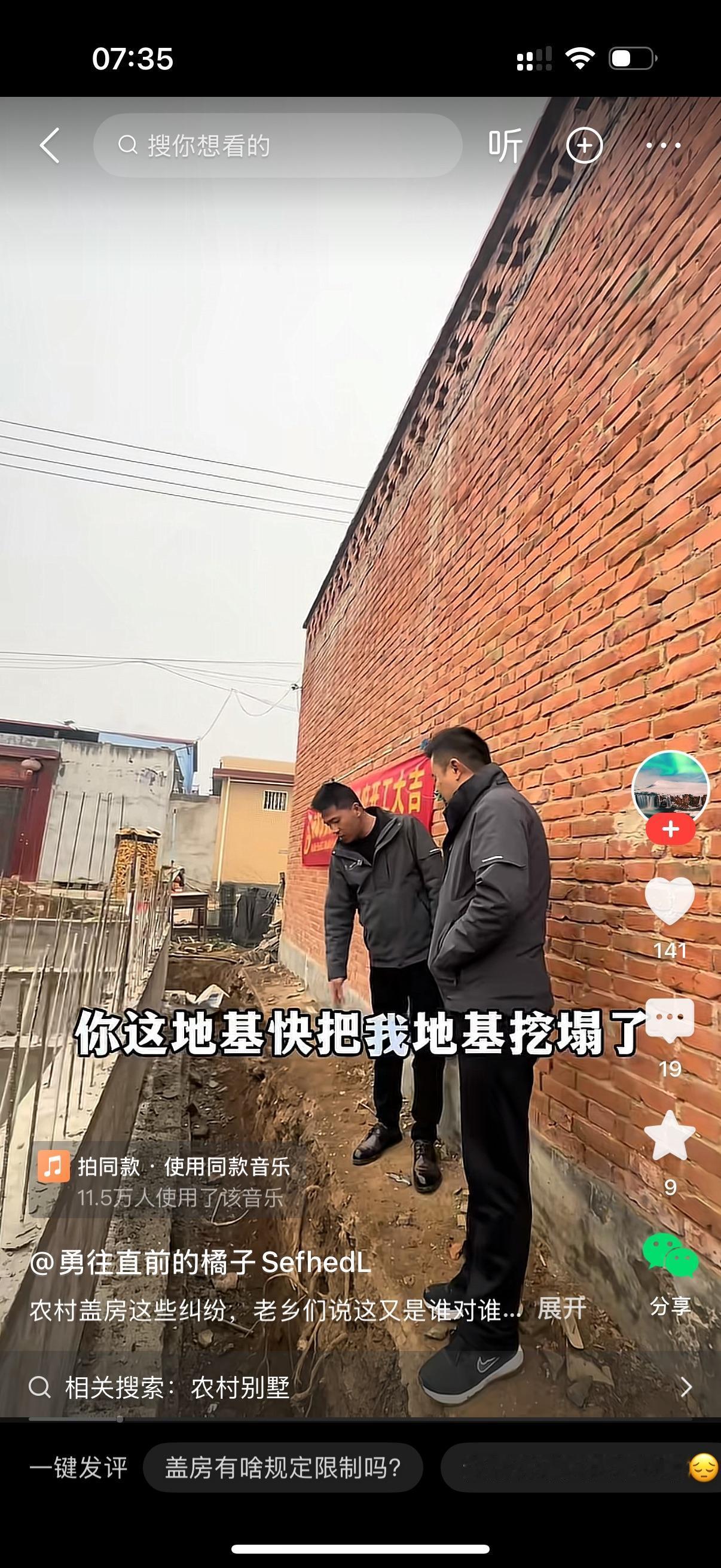男子对隔壁建房的邻居说,来来来,这搁你家盖房子也不打声招呼,你这地基快把我地基挖塌了。邻居说,我这房子是原址原建,而且还往里缩了50公分。现在这宽都快2米了。男子问,你这房子准备盖几层?邻居说,盖两层啊。男子说,我这房子是一层,看见没?邻居说,你一层关我两层啥事?男子说,你不能盖两层,你非得压我一头?你只能盖一层。你盖两层试试?你看我给你扒不扒?邻居也怒了,试试就试试,你还拽的很。男子说,那你别往这盖。邻居说,我的地在这里,我不往这盖往哪盖?两个人差点打起来。农村人就为这些小事斤斤计较。