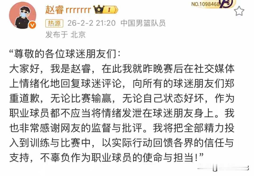 赵睿道歉太敷衍了,北京北汽输球后赵睿在评论区和新疆球迷发生互怼,第二天赵睿就在社交媒体道歉,有粉丝说赵睿敢作敢当。难道就没发现赵睿道歉根本就没提到新疆两个字吗?他在网上的言论是地域问题,为什么不对新疆球迷道歉。他在网上的言论是针对新疆球迷,其实赵睿就应该和新疆、北京北汽球迷道歉,自己这两年在这两个队拿着高薪,根本就没打过几场球,尤其新疆两个赛季加起来都没有一个赛季场次多