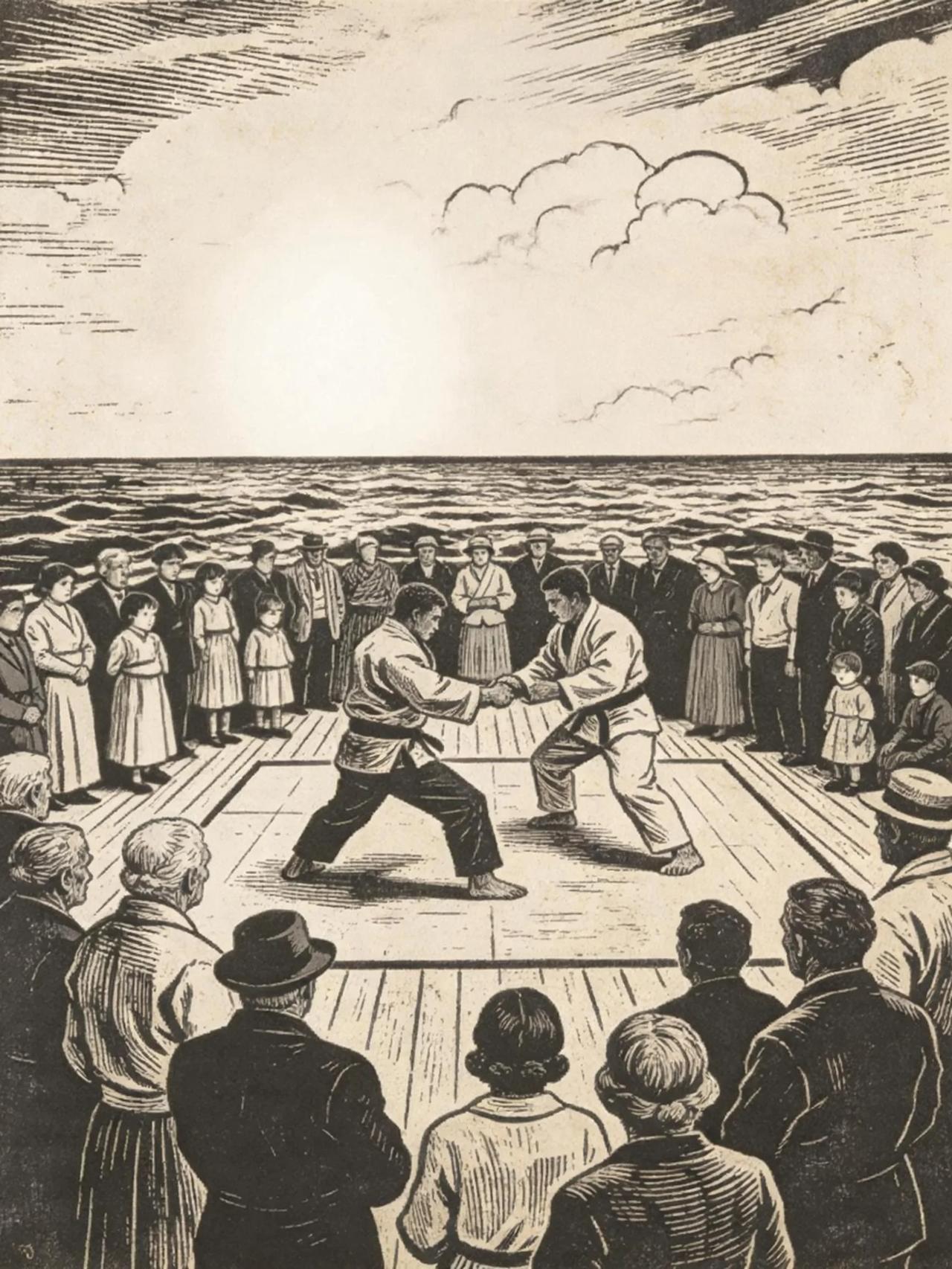 王铎:长篇小说《西镇》插图之十八:“樱花丸”号上的柔道比赛。