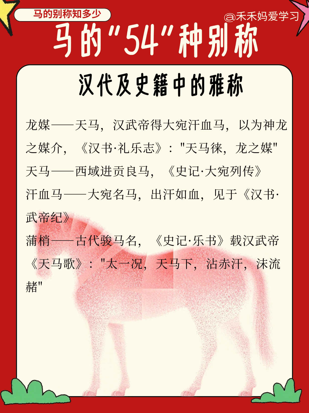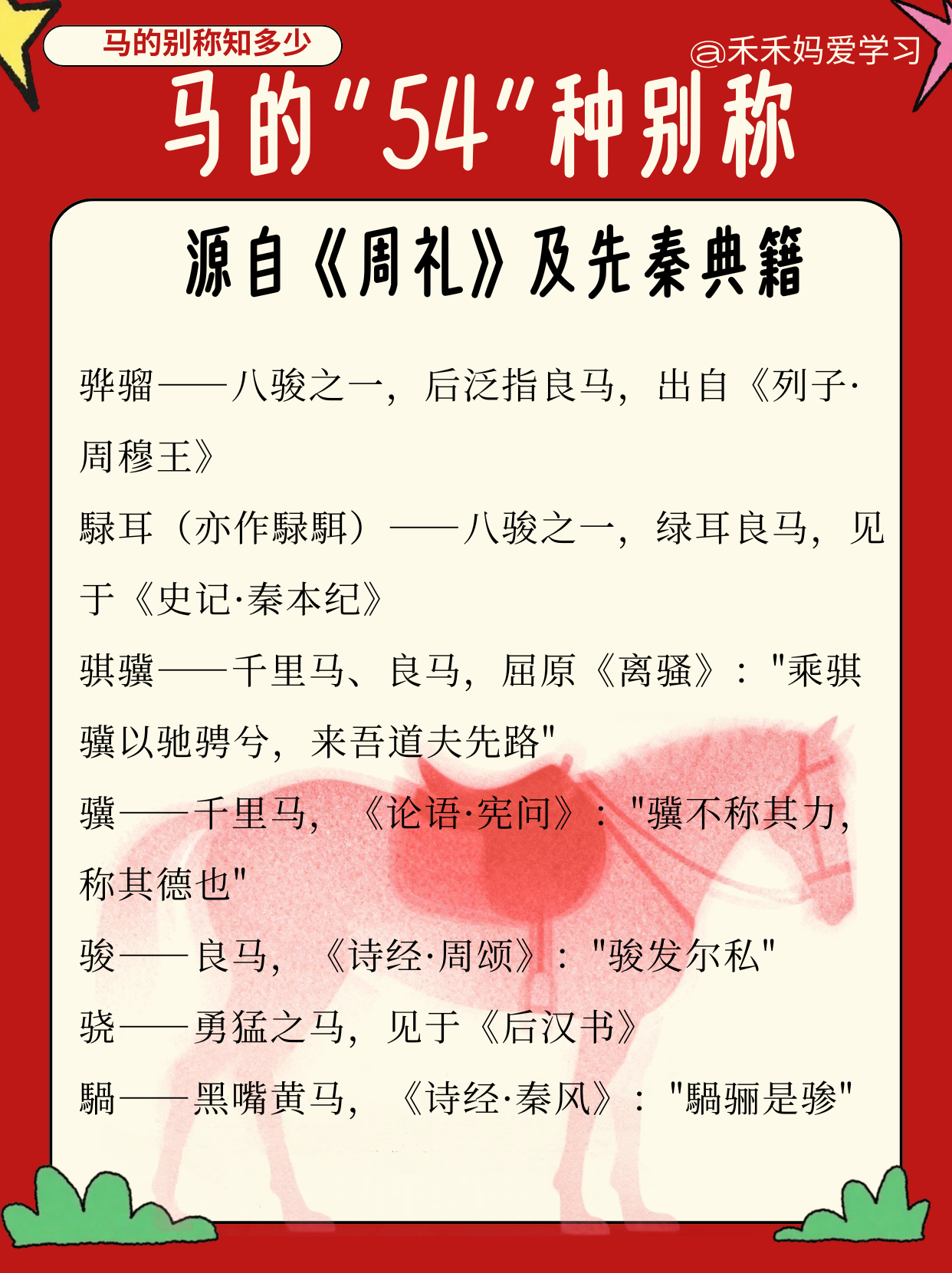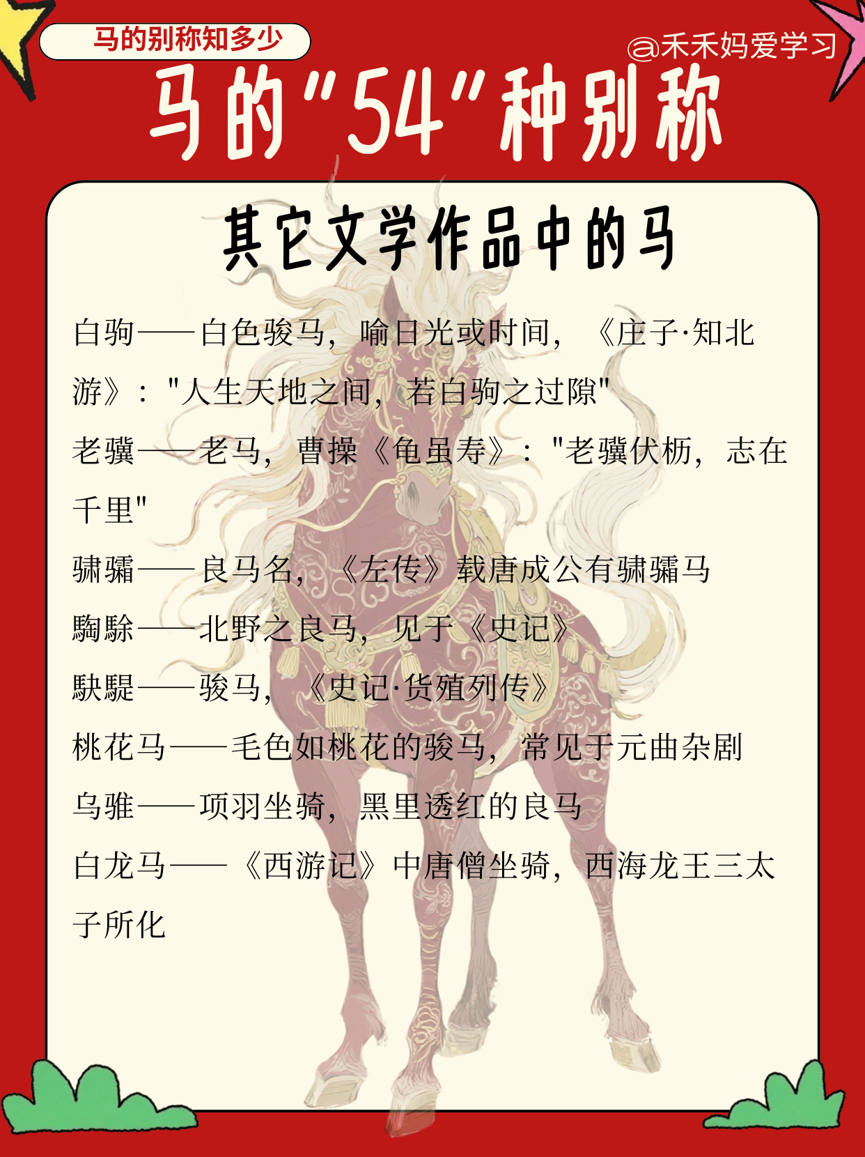 今天禾妈给大家整理了N种古人对马的别称,分享给大家。丙午马年就要到了,到处洋溢着“马元素”的符号和氛围。