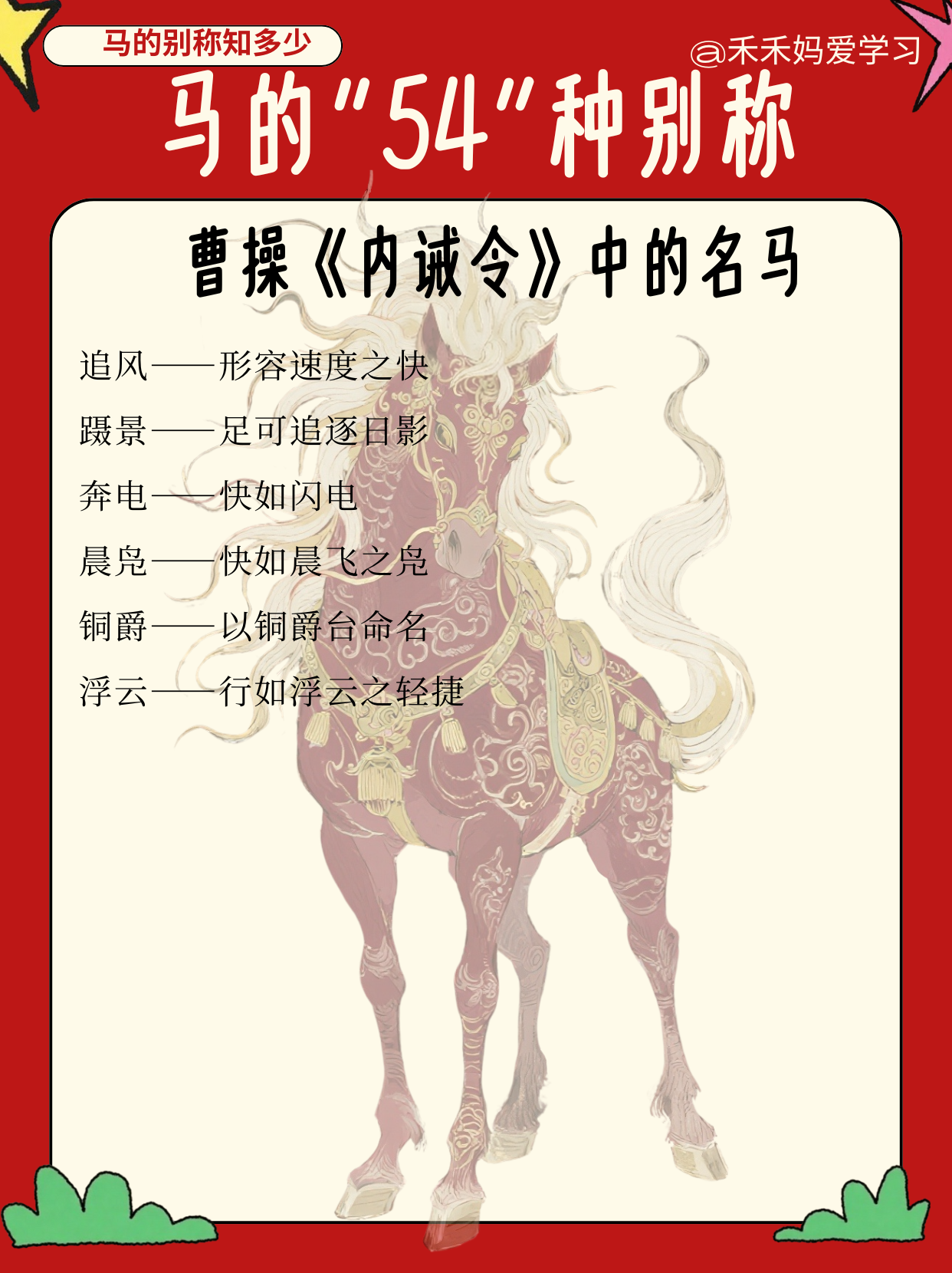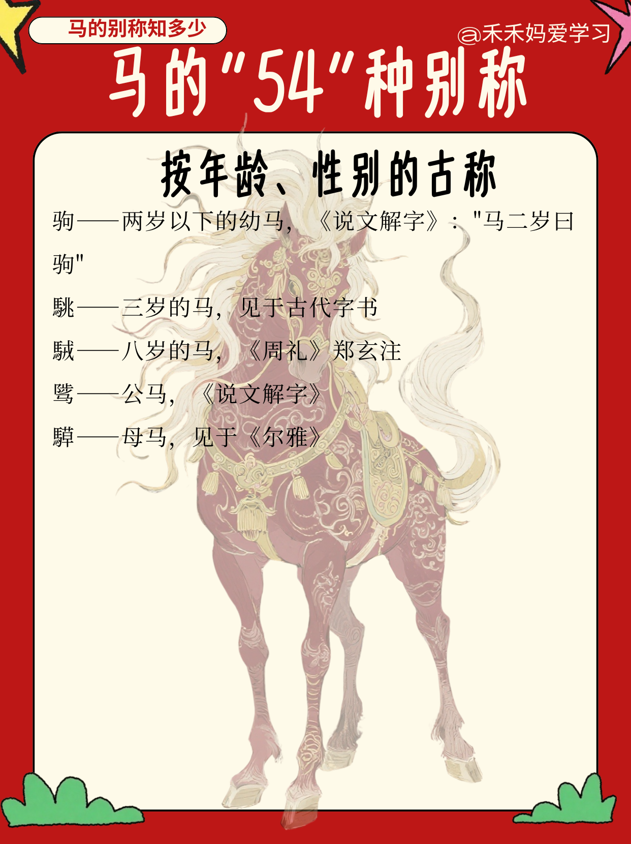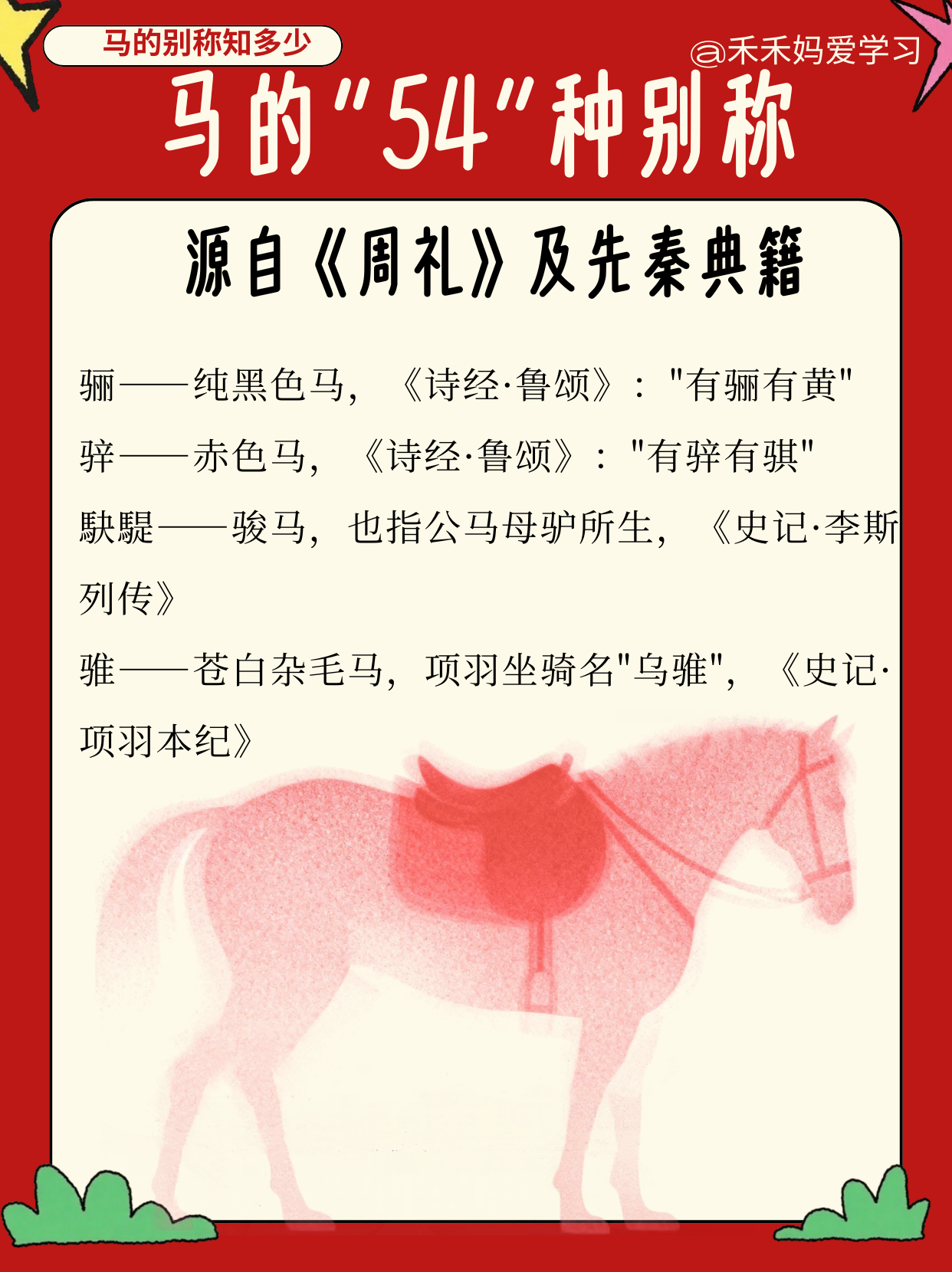 今天禾妈给大家整理了N种古人对马的别称,分享给大家。丙午马年就要到了,到处洋溢着“马元素”的符号和氛围。