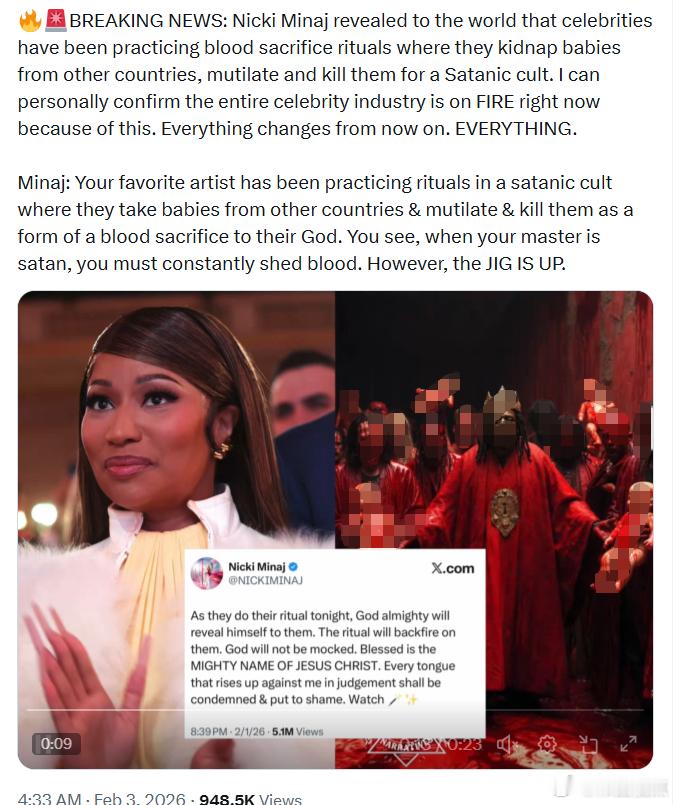 妮琪·米娜向全世界爆料称,一些名人一直在进行“献血祭祀”仪式,他们从其他国家绑架婴儿,对其进行残害并S害,作为撒旦邪敎的献祭。