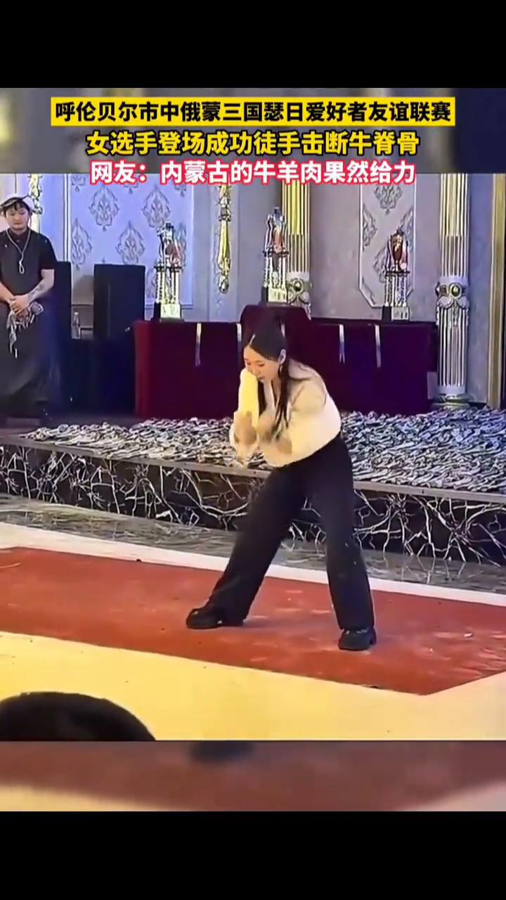 呼伦贝尔市中俄蒙三国瑟日爱好者友谊联赛女选手登场成功徒手击断牛脊骨。 网友:内蒙古的牛羊肉果然给力。
