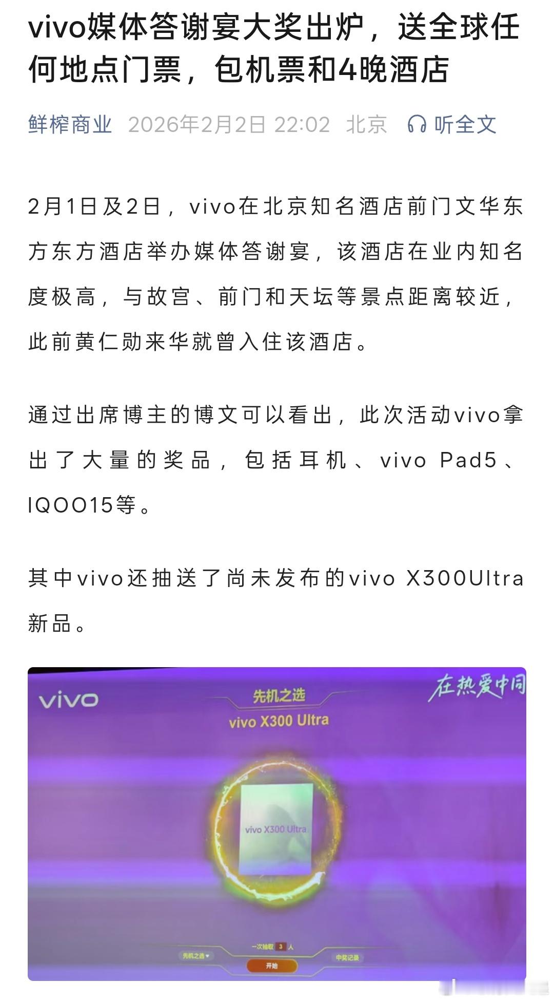蓝厂也是豪横啊,答谢宴直接把未发布的vivo X300 Ultra抽了,还有通往世界任一地点的门票及住宿