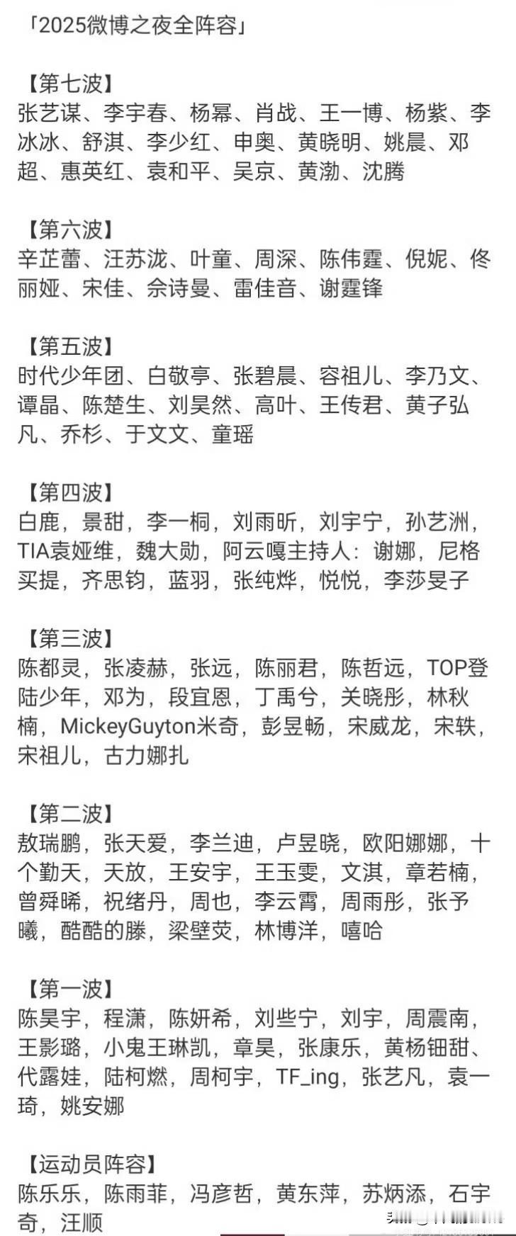 近日,2025微博之夜全阵容正式官宣,超过120多位文艺工作者受邀参加,我们一起来看一看都有哪些艺人吧? 主持人有谢娜、齐思钧、尼格买提、蓝羽、李莎旻子、张纯烨等,尼格买提和齐思钧已经主持过几届微博之夜了。 我关注的艺人有肖战、周深、陈楚生、王一博、杨幂、杨紫、十个勤天、时代少年团、黄子弘凡、刘昊然、魏大勋、王安宇、姚安娜、张凌赫、张远等,顶流都到齐了。 运动员有陈芋汐、汪顺、苏炳添等,陈芋汐的商务活动越来越多了,真不错呀。 微博之夜将于2月5日线上直播,大家比较哪一位嘉宾呢?
