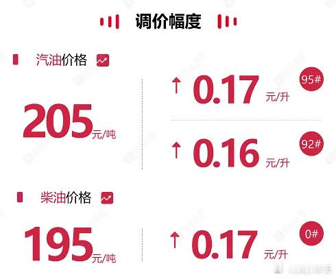 油价上调 今天2月3日24时将上调汽柴油限价,每吨汽油上调205、柴油上调195元,折合每升890.15、920.16、950.17、00.17元。今天下班赶紧去加油