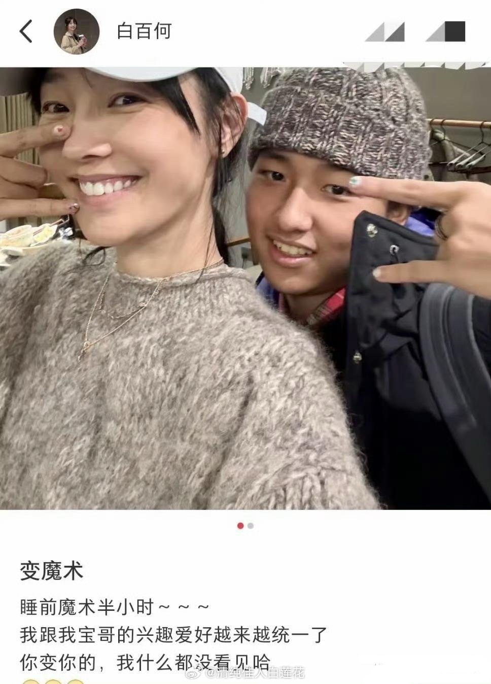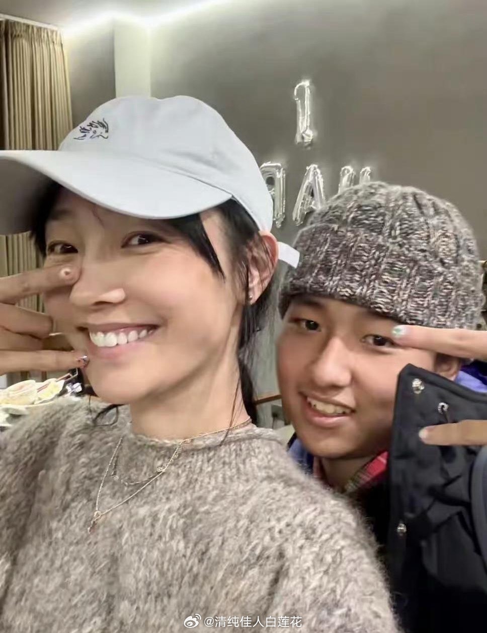 白百合和大儿子合影,19岁元宝戴帽子像小老头,母子俩都做了美甲