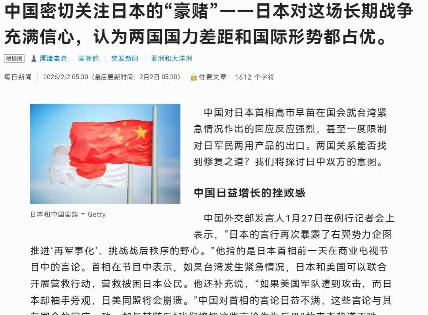 日媒对我们警告!日媒表示,中国的对日强硬,只会适得其反!2月2日,日本每日新闻刊文表示,中国对日本首相高市早苗在国会就台湾紧急情况作出的回应反应强烈,甚至一度限制对日军民两用产品的出口。但毫无疑问,中国的挫败感日益“增强”。关于解散众议院和举行大选,中国官方立场是“这是日本的内政,我们不予置评”,但显然中国正在密切关注首相高市亮一“豪赌”的结果。 说白了,日媒叫嚣中方对日强硬“适得其反”,表面看是舆论施压,实则是掩盖日本困境的自欺欺人,这番论调既颠倒因果,又错判民意与实力,纯属为高市早苗的政治豪赌站台。 要知道,高市早苗公然宣称“台海有事构成日本存亡危机”,中方才限制军民两用产品出口,可日媒只字不提日方挑衅,反倒炒作“中方挫败感”;这说辞配上中国赴日游客暴跌42%、760亿订单清零的现实,活像打肿脸充胖子。 可这绝非单纯的舆论抹黑,而是为政治私利的刻意误导。日媒清楚高市内阁支持率已暴跌10%,民众抗议不愿为政客买单,才炮制“反华推高支持率”的谎言。说白了,是想转移国内矛盾,给濒临失控的对华政策找借口。 说实话,所谓“适得其反”,恰恰是日本自食恶果。 日本一边对华搞半导体材料出口管制,一边想保住中国市场,这种双标操作遭中方冷处理。4000多家在华日企破产撤资,旅游业损失惨重。 而中方反制始终有理有节,绝非意气用事。限制出口只针对军民两用物项,不伤及普通贸易,还保持沟通渠道。反观日本,在野党都痛批高市言论违背日中联合声明。 更关键的是,日媒忽略了美国的“背刺”真相。美国嘴上卖军火给日本,却悄悄撤走“堤丰”导弹系统,把日本推到对抗前线当炮灰。这种盟友靠不住、经济受重创的困境,才是日本的真实处境。 要清楚,上世纪80年代日美贸易战中,日本也曾试图硬抗,结果经济陷入“失去的二十年”。如今重蹈覆辙,靠挑衅转移矛盾,注定难改颓势。 而未来,局势大概率会有两种走向。一种是高市被迫收敛:在经济压力与党内质疑下,撤回涉台错误言论,主动修复中日关系,中方顺势调整反制措施; 另一种是对抗持续升级:高市执意绑定美国,中方则加码稀土等关键资源管控,日本制造业断链加剧,支持率进一步下滑,甚至引发内阁动荡。关键转折点在日本大选结果,若高市未能连任,新政府或重启对华务实合作,反之则中日关系将持续冰封。 说到底,日媒的警告不过是自欺欺人的谎言。这场博弈的本质,是挑衅与反制的较量,是单边主义与多边正义的对抗,日本若不认清自身困境、停止错误行径,最终只会搬起石头砸自己的脚,所谓“适得其反”终将反噬自身。 以上是小编个人看法,如果您也认同,麻烦点赞支持!有更好的见解也欢迎在评论区留言,方便大家一同探讨。