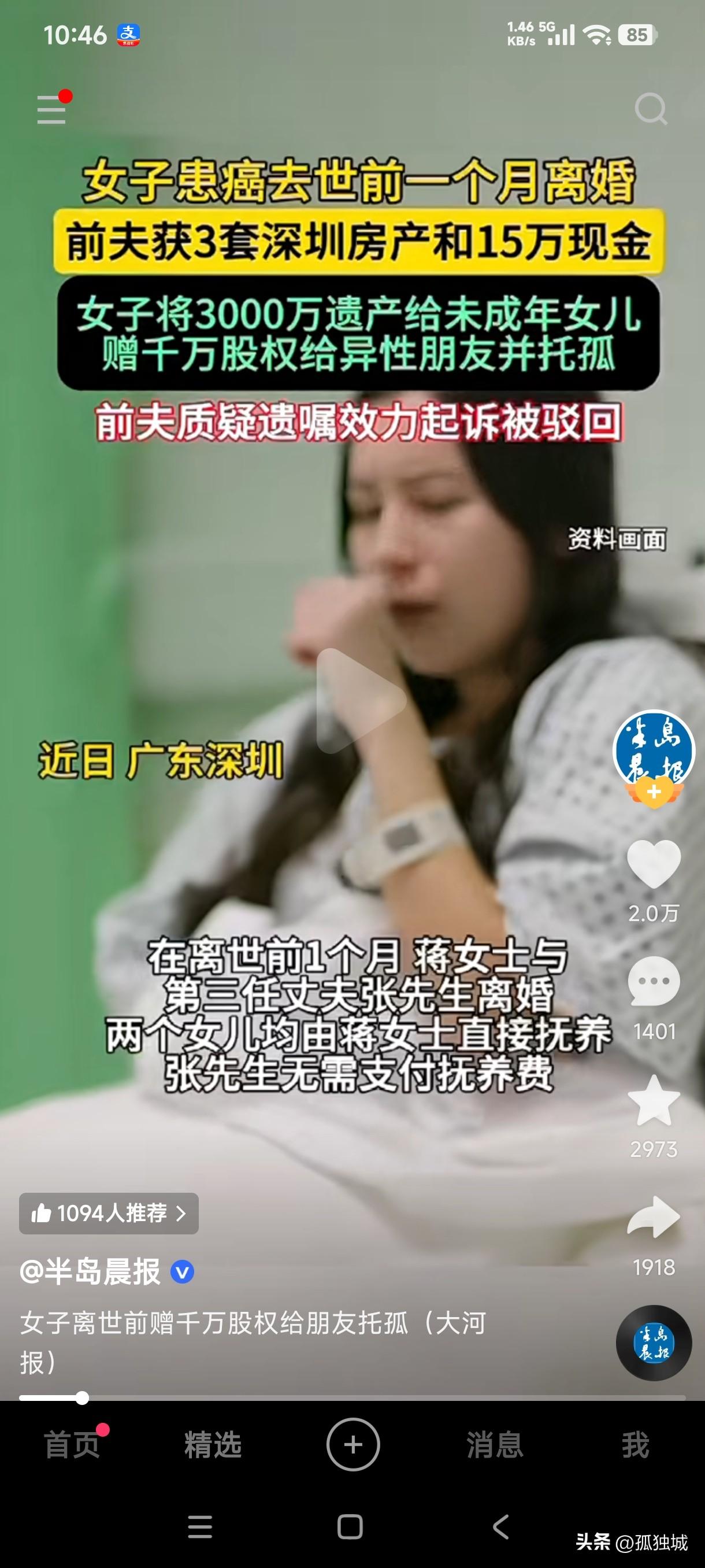 女子患癌去世前一个月离婚,前夫获得3套深圳房产和15万现金,女子将3000千万遗产给未成年女儿,赠千万股权给异性朋友并托孤。 以前在电视剧里看到过皇帝给大臣托孤的,这现实生活中居然也发生了托孤的一幕,而且还是女子在去世前给异性朋友托孤,这操作看的真是让人傻眼了,她托孤一托居然还是两个女儿,她就那么相信这位异性朋友吗?并且她连孩子的父亲都不相信,为什么不把孩子让父亲照顾呢?偏偏要赠与异性朋友千万股权,还要让他帮忙照看孩子,这对异性朋友都能如此信任,为什么就不相信枕边人呢? 这位女子临死之前托孤的事,也许对于他老公来说做梦都没有想到,自己的孩子却让老婆托付给了别人照顾,这种事到底该让人如何去接受,难道孩子不是他老公的吗?