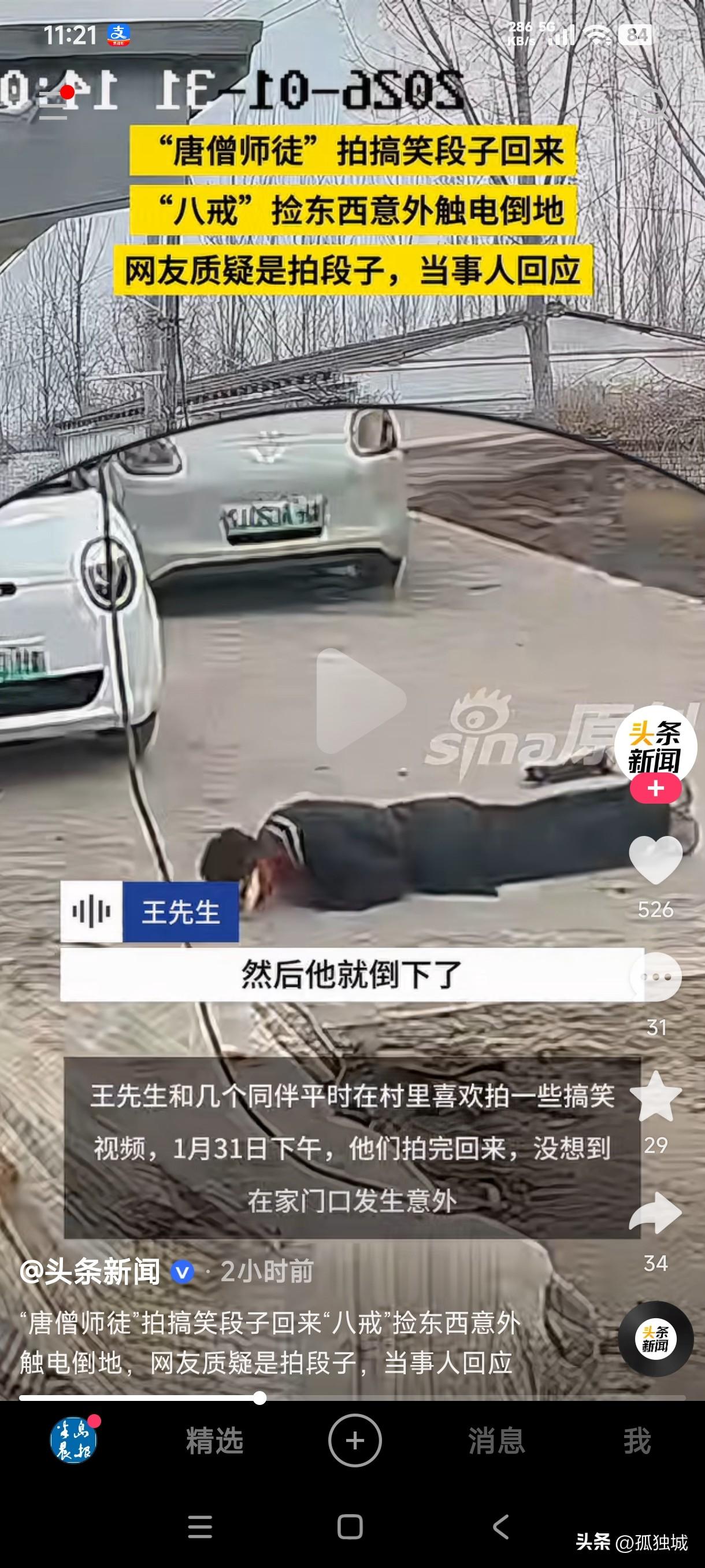 山东济宁唐僧师徒四人拍完搞笑段子回家,猪八戒弯腰捡东西时意外触电倒地,网友质疑这是他们拍的段子,但当事人回应说这是真的被电到了。 这可真是让人笑不活了,猪八戒没想到自己随手捡到的东西竟然是带有电的电线,网友们都以为这是他们拍的段子,谁能想到他是真的触电了,这也把其他的三人吓的不轻,立即找来棍子把猪八戒给扒拉在一边去,这可真是太吓人了,万幸没什么大事,这如果是大功率的电,这唐僧师徒四人不是少了老猪吗?