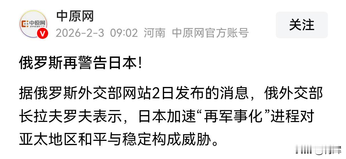 说到做到!绍伊古访华第2天俄罗斯就向日本发出警告 绍伊古在2月1号访华的过程中明确指出俄罗斯和中国在对待日本的立场上是一致的。坚决反对这个岛国想要再次军事化的企图。 而绍伊古回去之后,俄罗斯方面也确实是说到做到,拉夫罗夫2号当天直接向日本发出了警告,说日本现在进行的再军事化行动已经威胁到了地区和平与稳定。警告日本这个国家要从历史中汲取教训,不要重走当年的老路,不要给地区局势和自身的带来重大灾难。 俄罗斯的这番表态一方面代表了中俄在对日问题上的一致性,而另外一方面,极有可能说明接下来两个世界大国将有可能在军事领域进行联合活动,进一步的制裁日本。而在目前开展的中俄各项军事联合行动中,针对日本也确实是一个主要的方向。去年12月份,中俄联合空中巡航过程中,两国的轰炸机和战舰就曾经出现在日本的北部和东部相关的海空域。 而目前日本国内也是一团乱麻,高市早苗解散了众议院,新一轮的选举马上要开始。在这个节骨眼上,日本首相又声称生病要缺席一些重要活动。再加上日本内部的经济危机是愈演愈烈,这个岛国已经出现了内忧外患的局面。