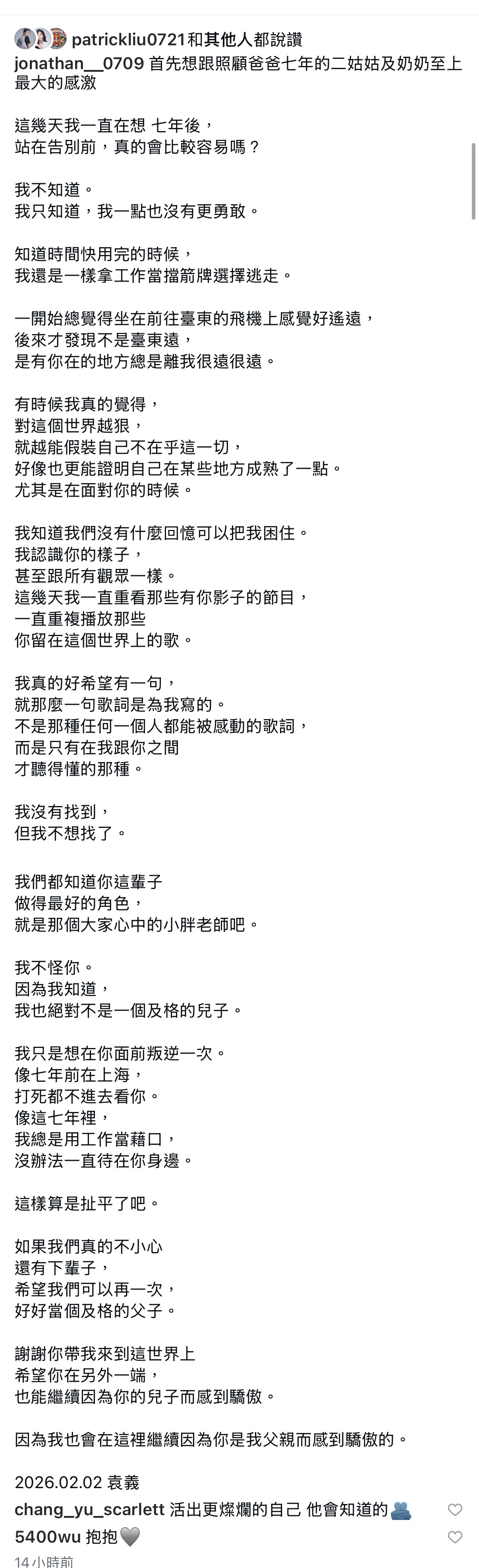 袁义是袁惟仁和前妻陆元琪的孩子,袁义在社群写下长文悼念父亲,他坦言这些年一直用工作逃避去看爸爸,他认为爸爸这些年扮演的最好的角色是「小胖老师」,但他自认也不是个及格的儿子,「如果我们真的不小心,还有下辈子,希望我们可以再一次,好好当个及格的父子。」